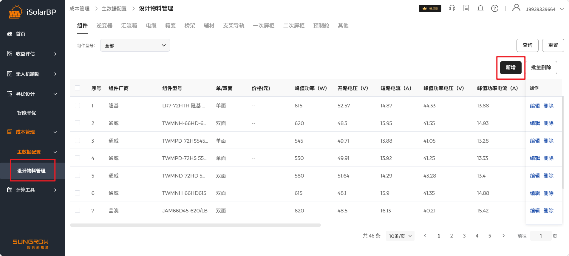 在该界面可新增组件、逆变器、电缆、箱变等物料数据,用于寻优设计