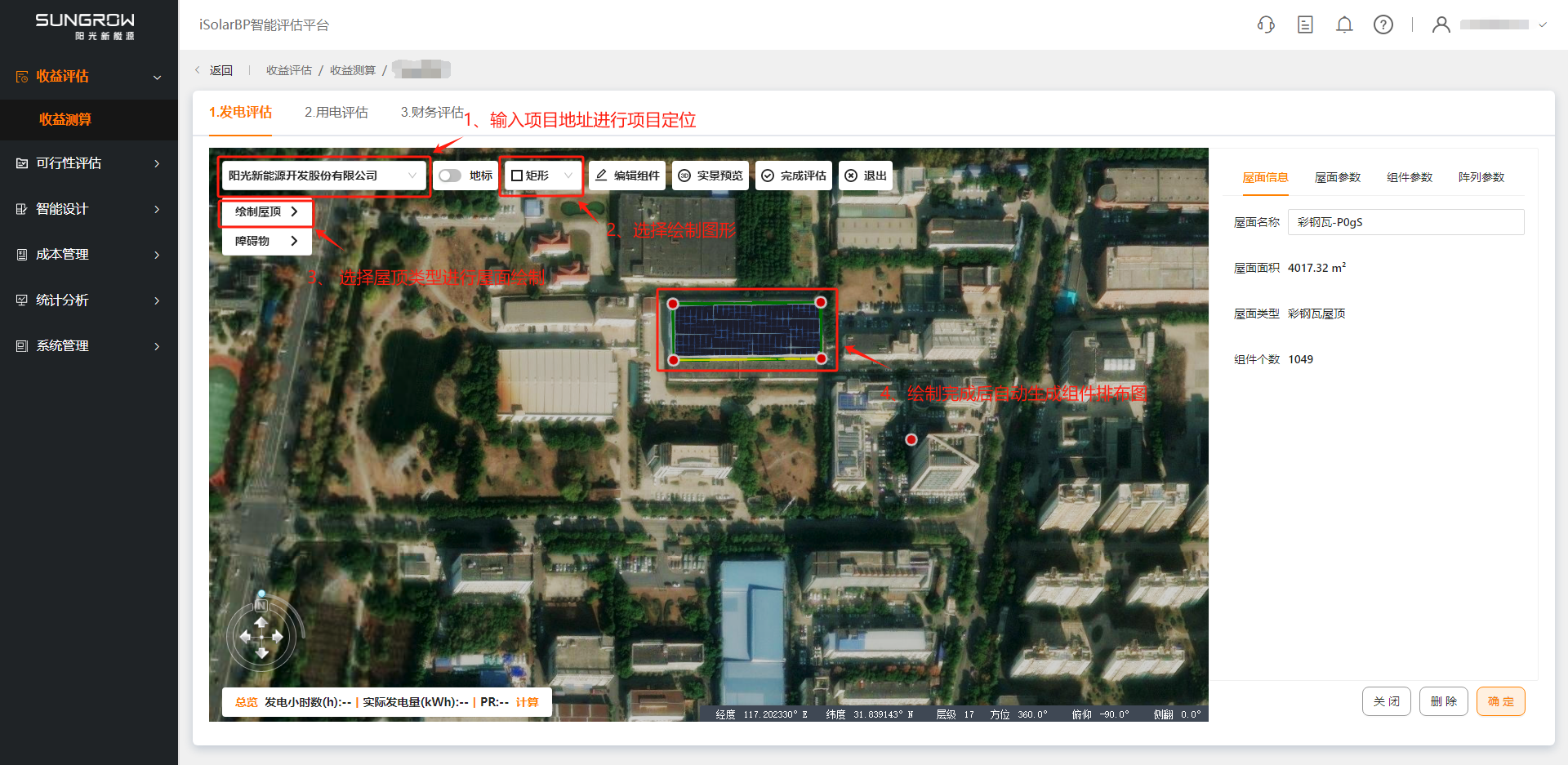 1)输入项目地址后进行项目定位,选择绘制图形以及屋顶类型后进行屋顶轮廓绘制,绘制完成后自动生成组件排布效果图