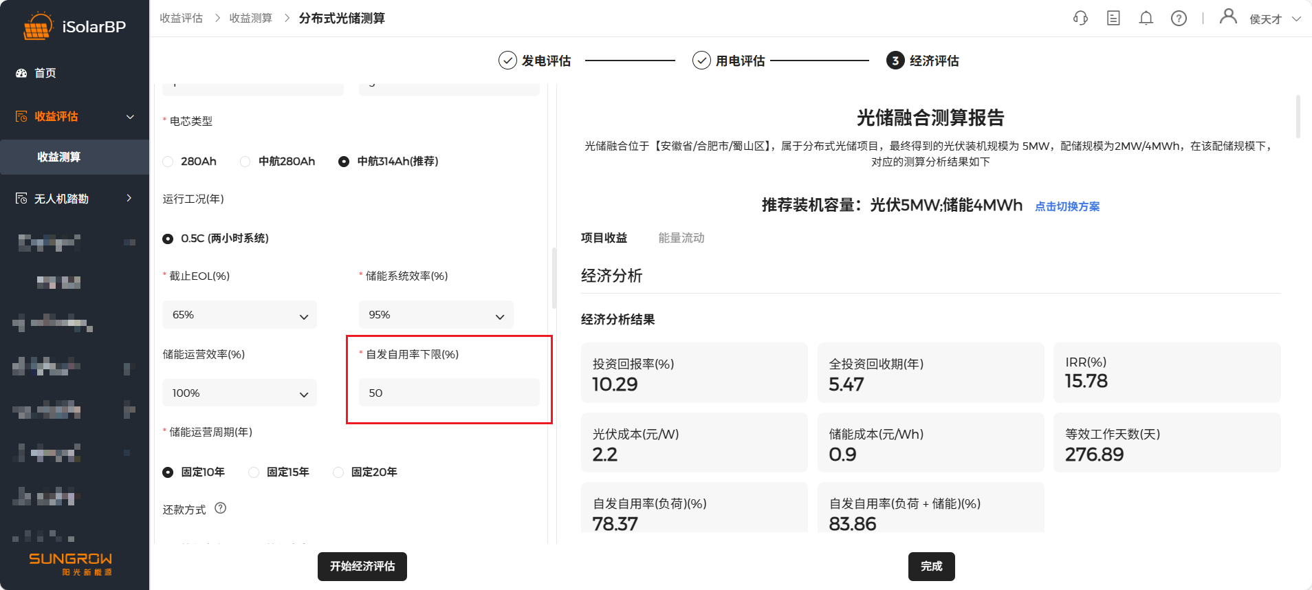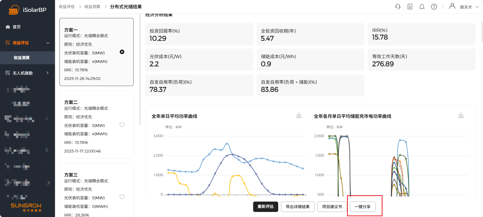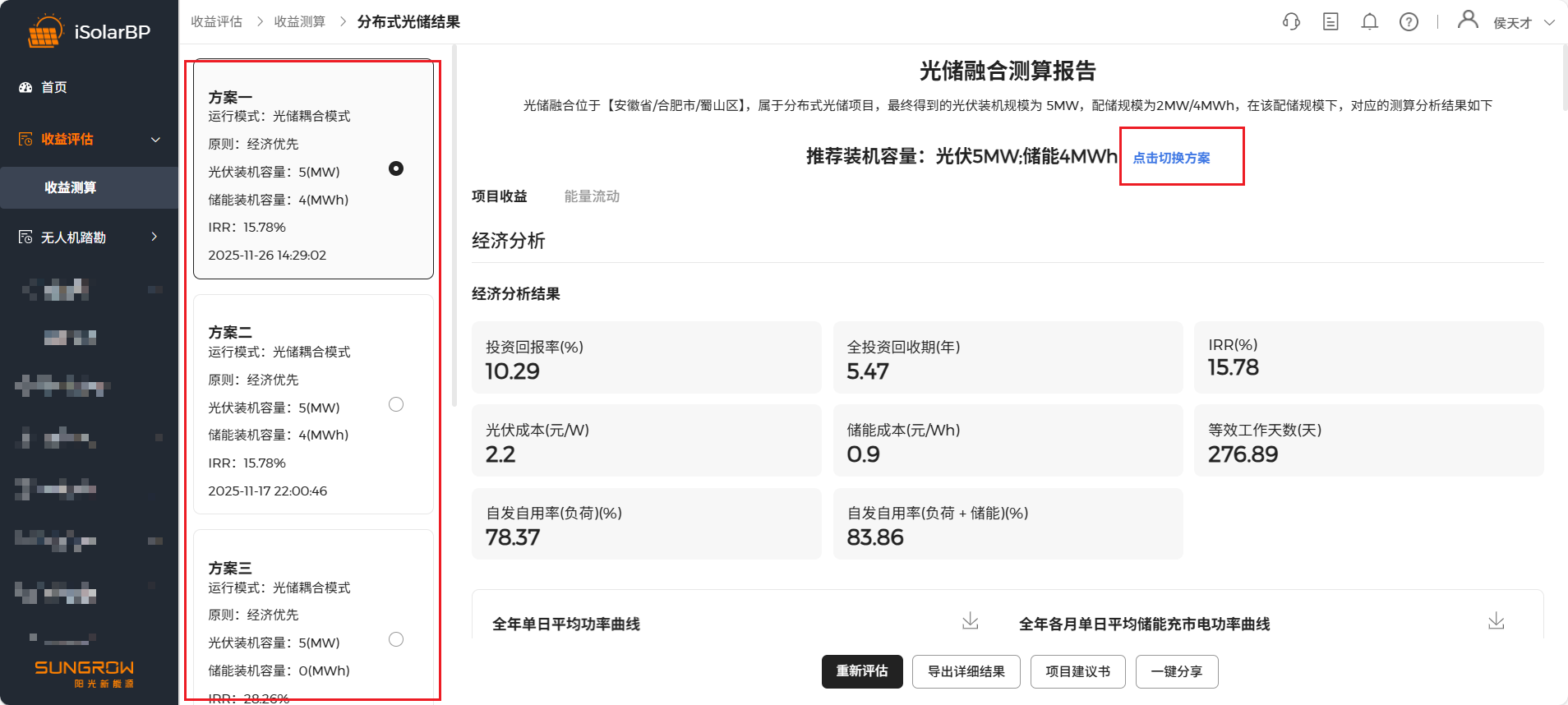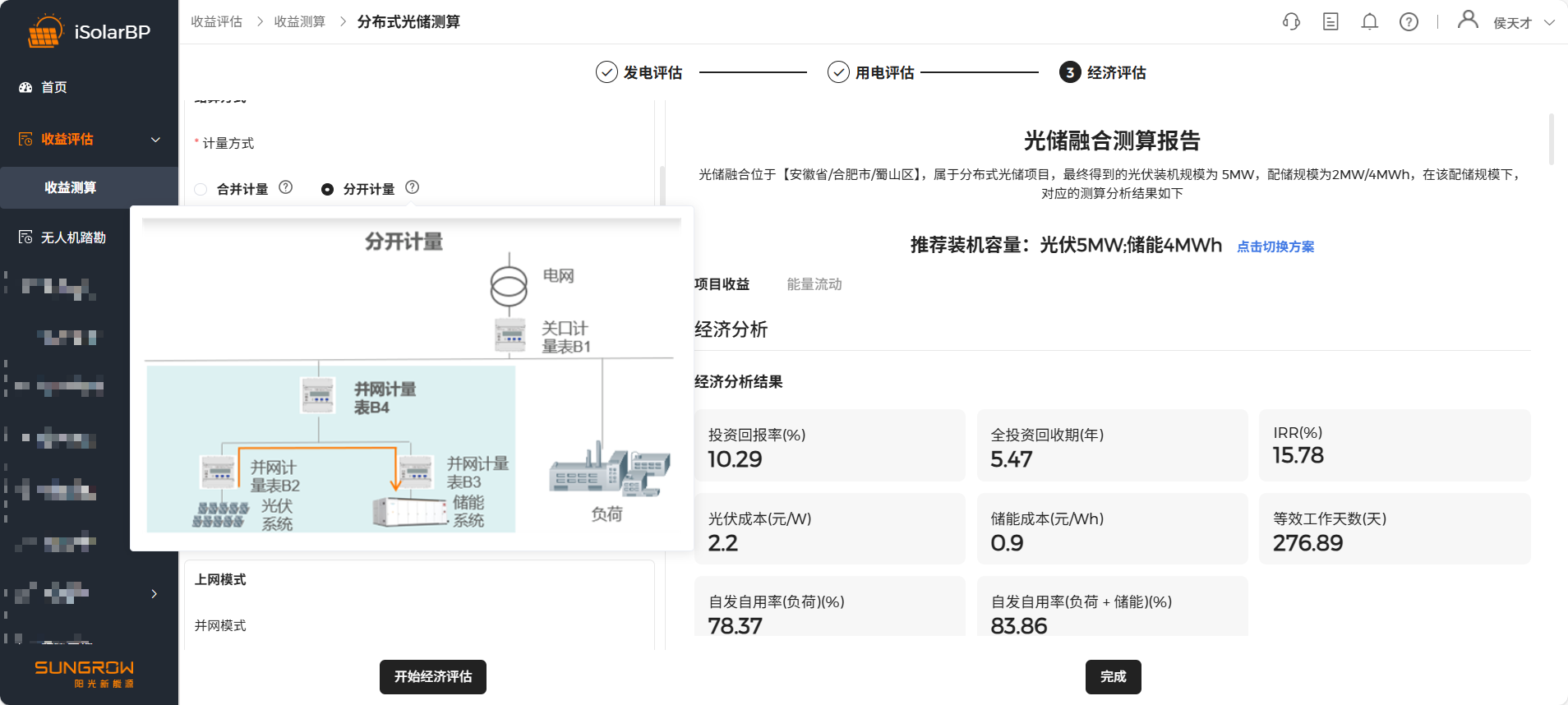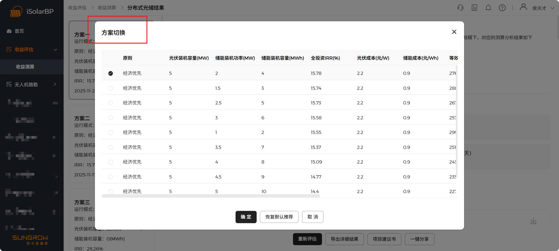 点击 “开始经济评估” 按钮开始测算,测算完成后进行测算结果查看,左侧记录历史测算结果,点击切换方案可查看不同配储方案测算结果,软件根据配储起始值会推荐10套配储方案。