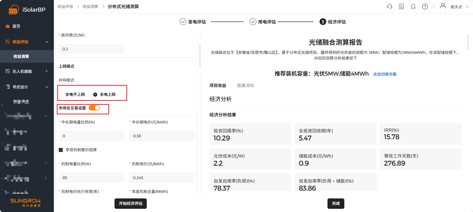支持余电不上网和余电上网两种模式,若选择余电上网,需输入上网电价或者选择市场化交易模式,若选择市场化交易模式则需要输入中长期电量比例、中长期电价等市场化交易参数。