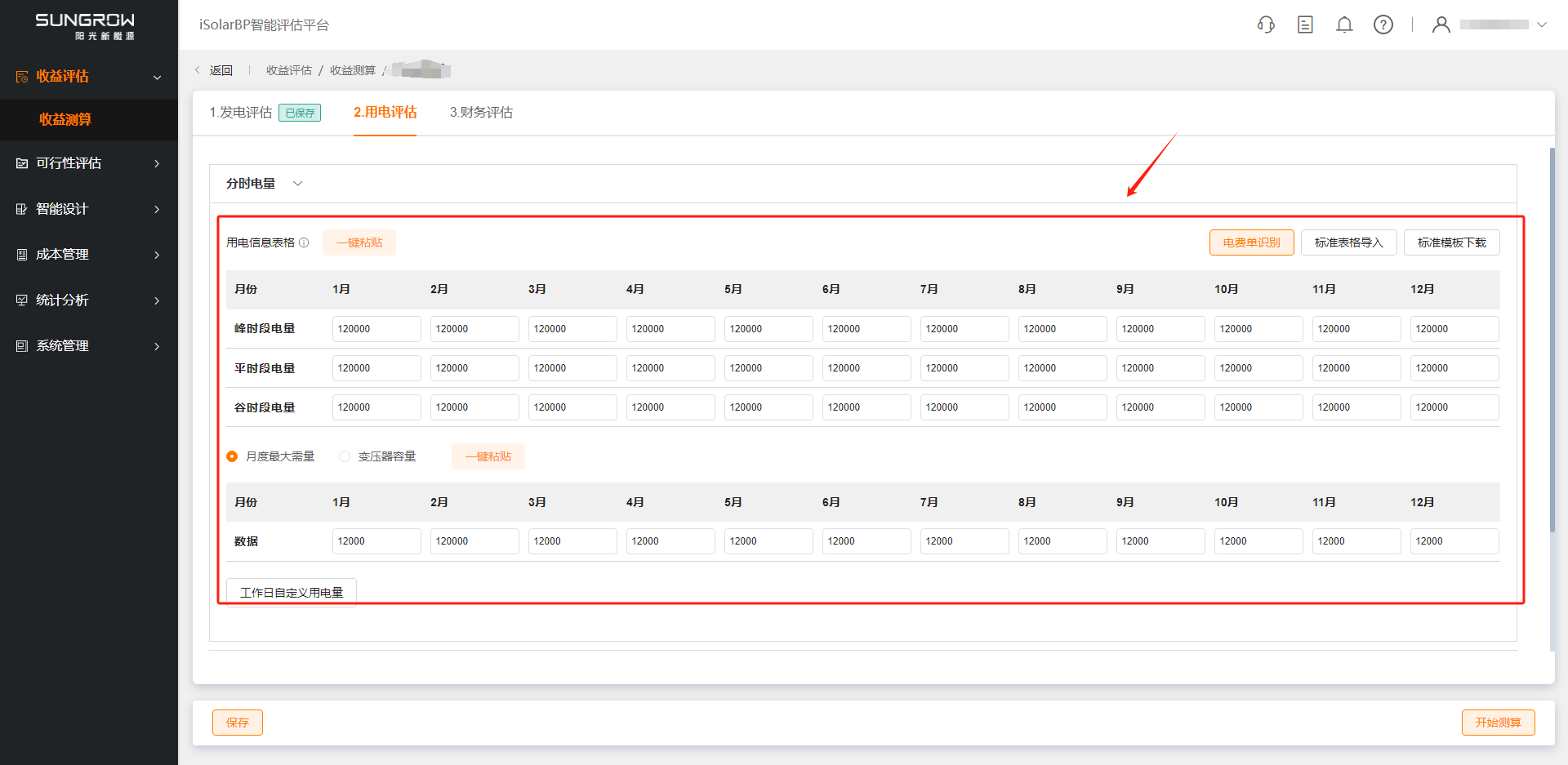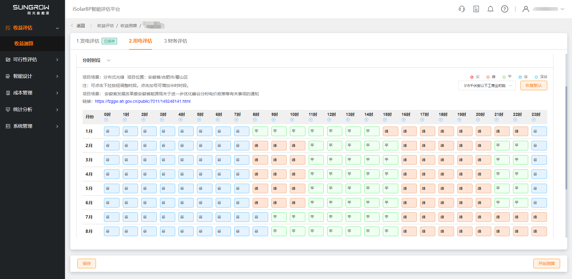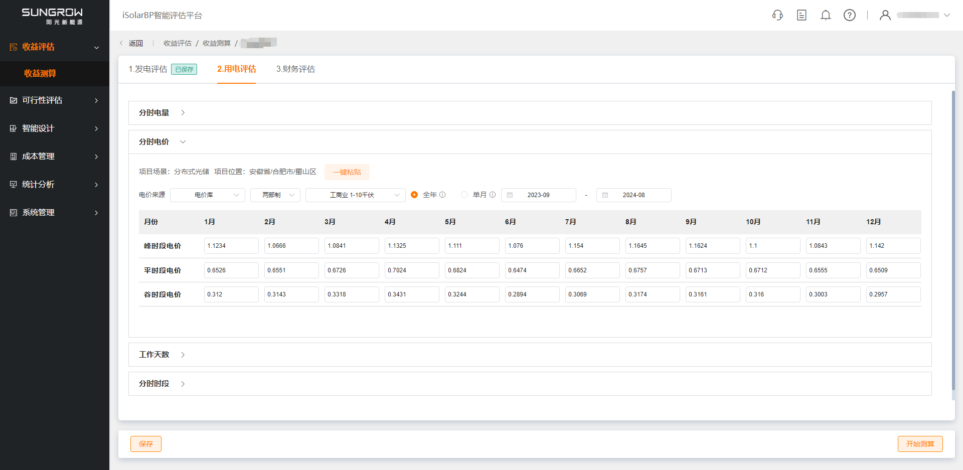用电评估包括分时电量、分时电价、工作天数、分时时段四项数据,数据确认后点击“保存”按钮得到光伏自发自用率与加权电价。