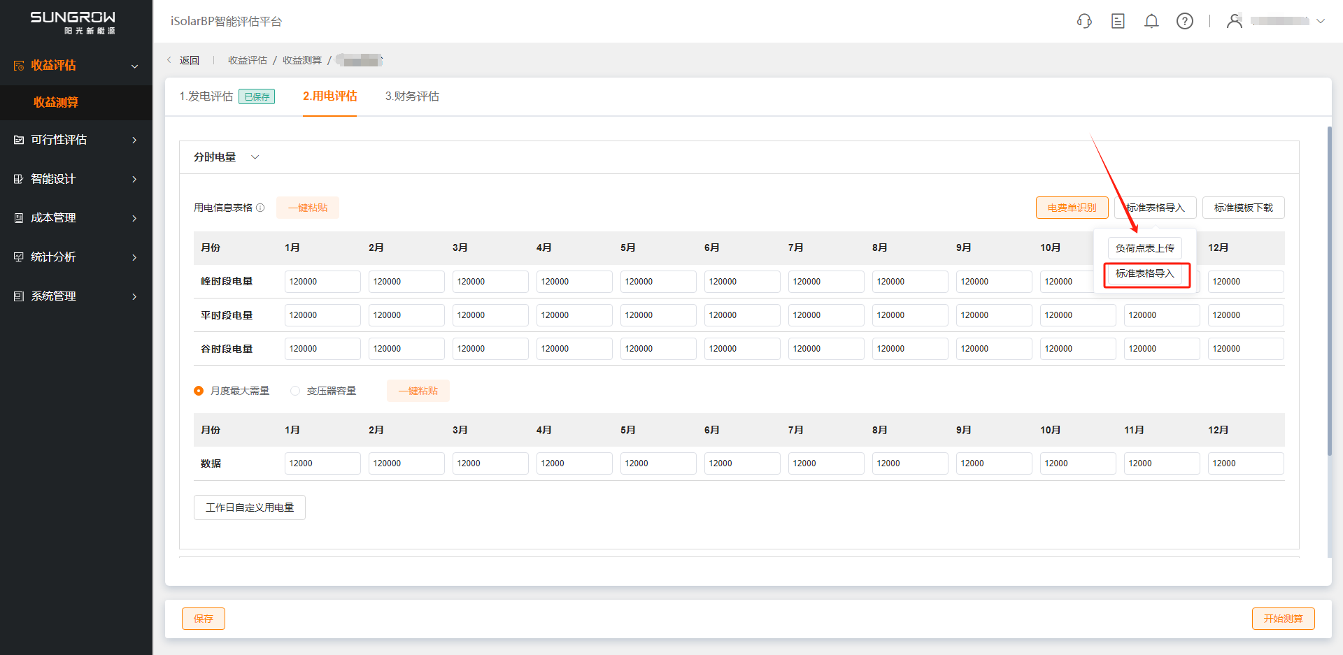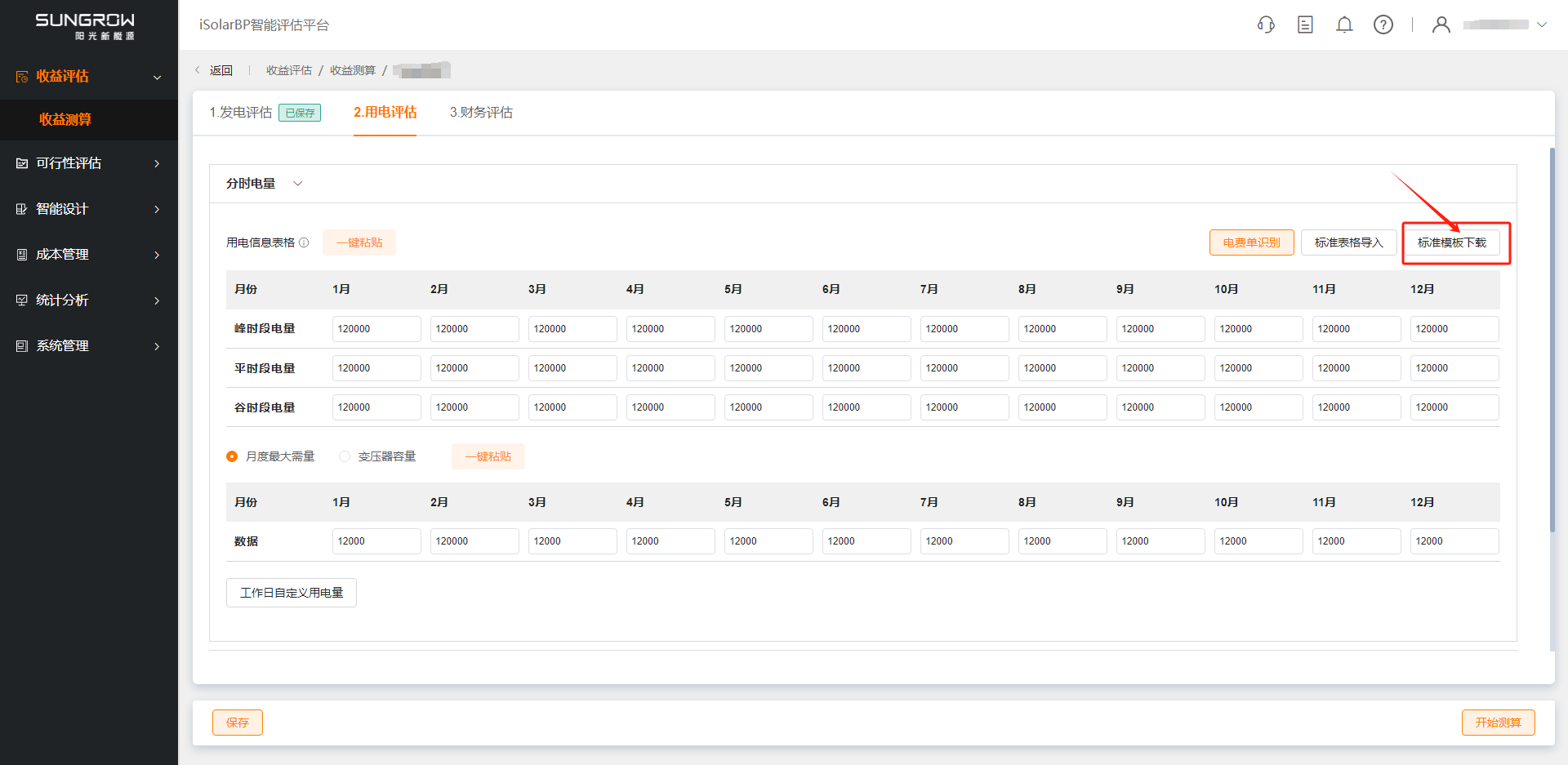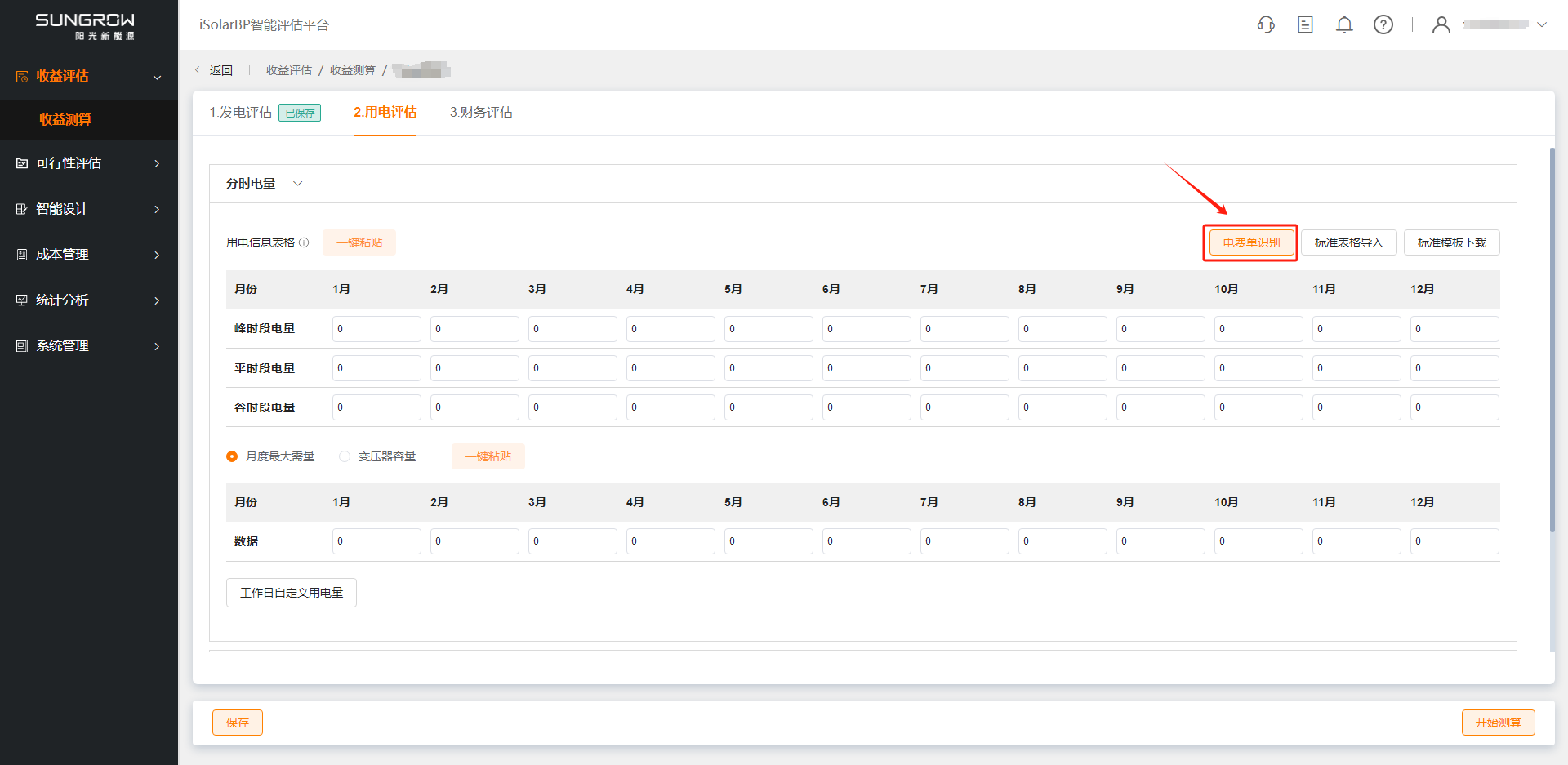 用电评估包括分时电量、分时电价、工作天数、分时时段四项数据,数据确认后点击“保存”按钮得到光伏自发自用率与加权电价。