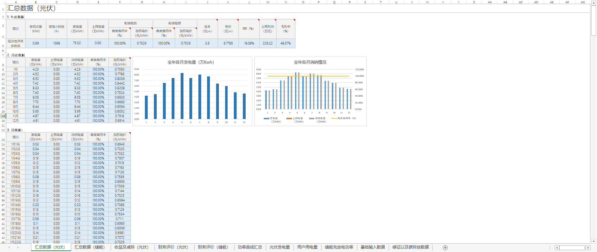 在测算结果页面点击 “导出表格” 可导出财务测算一览表,表中有“汇总数据”、“收益及减排”、“财务评价指标”等数据可供查看。