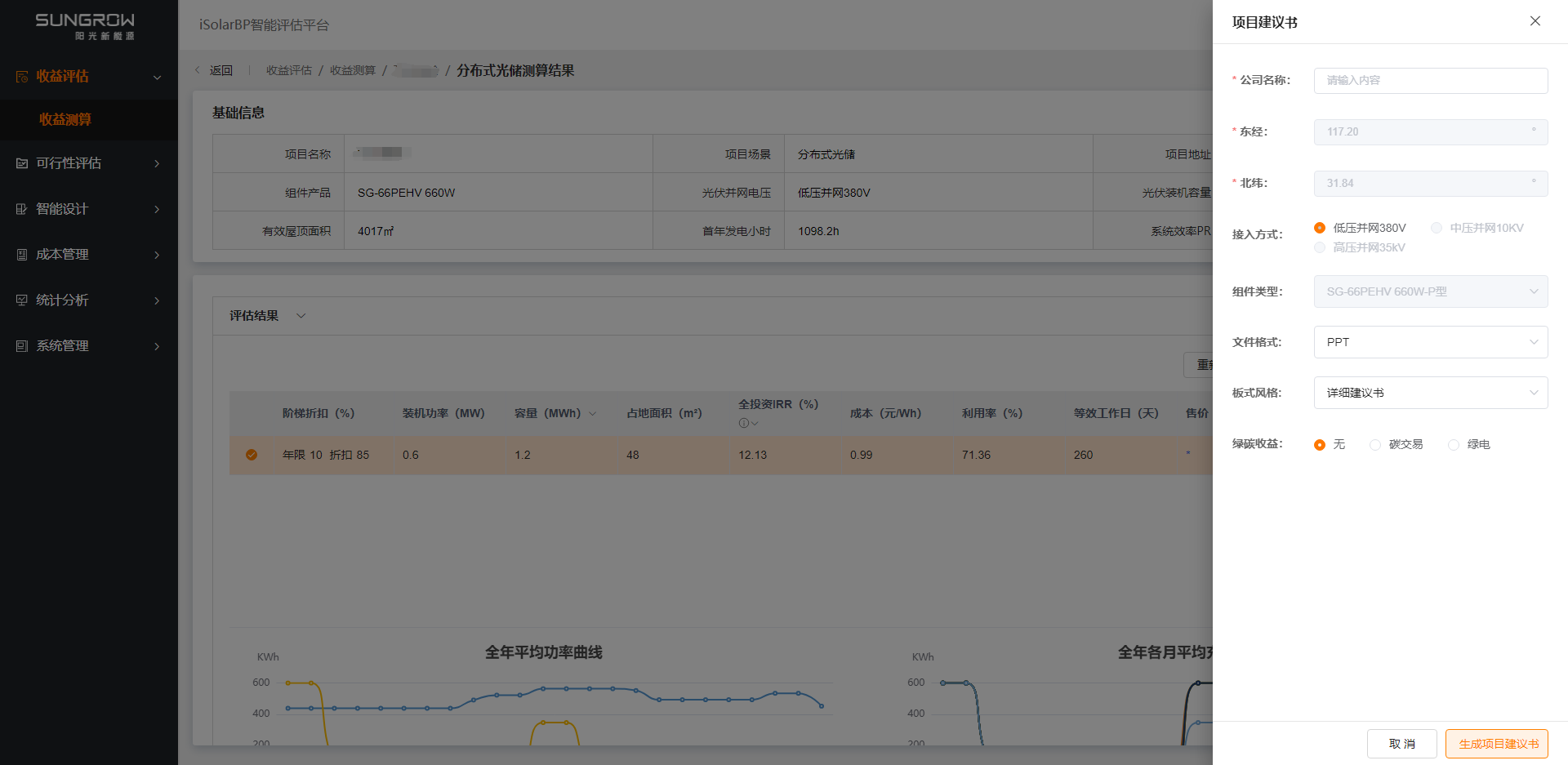 在测算结果页面点击 “项目建议书” 后弹出弹窗,填写必要信息如公司名称等,点击 “生成项目建议书” 下载项目建议书。