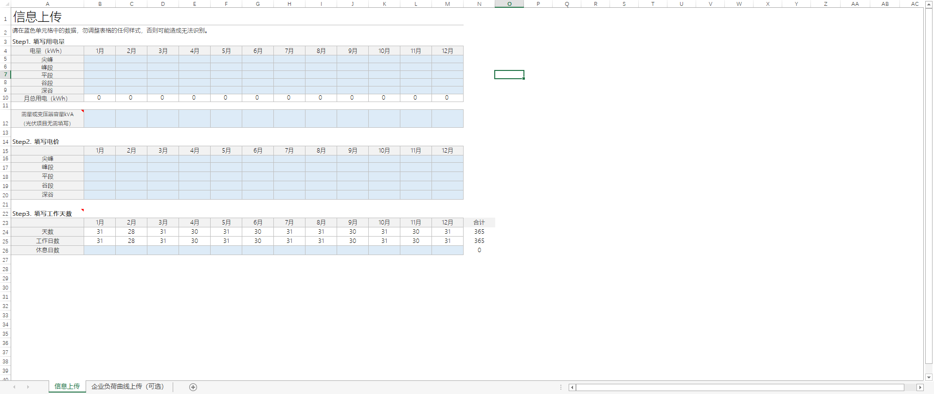 支持使用标准表格导入功能进行电量数据导入,需要先下载标准表格模板,并在Excel中填写电量电价数据或负荷曲线数据后进行导入