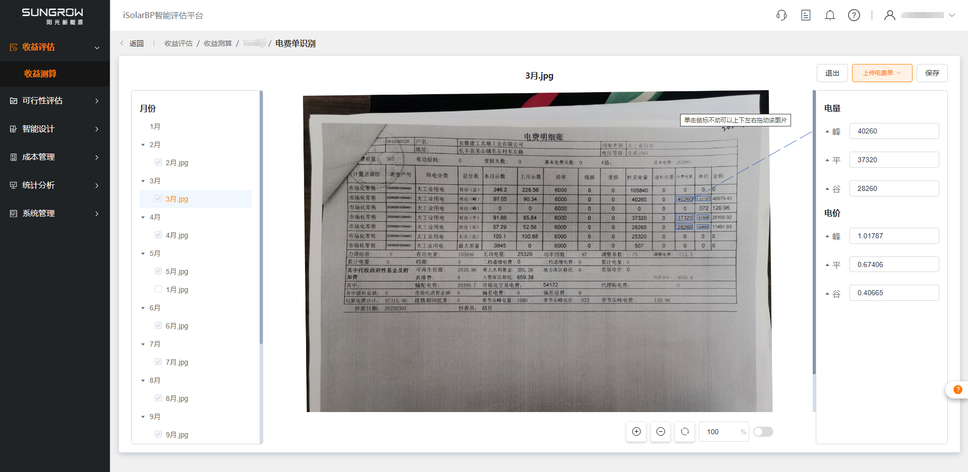 - 点击 电费单识别 按钮进入电费单识别页面,上传的电费单文件自动解析后进行展示