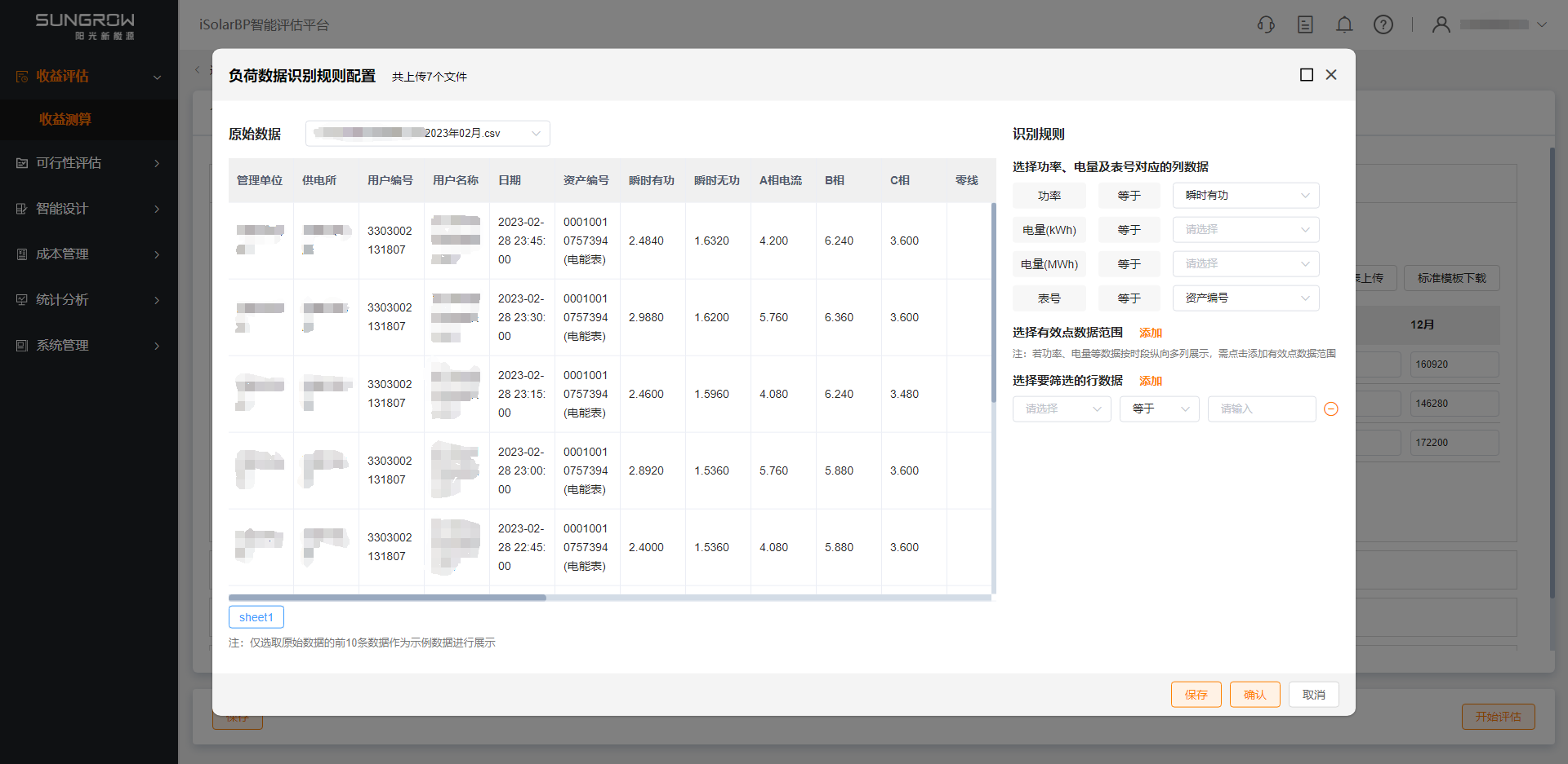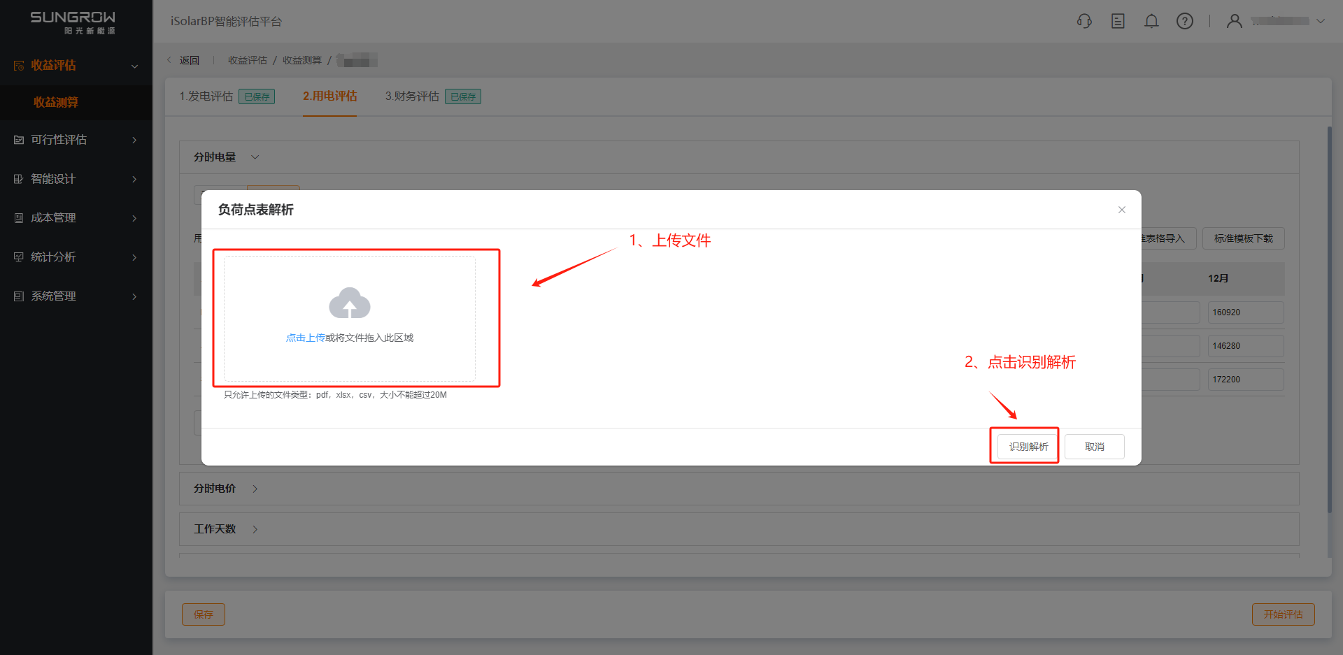 有负荷点表时,支持上传负荷点表文件,目前系统支持对pdf、xlsx、csv格式的文件进行识别解析;若存在部分月份负荷数据缺失,系统自动进行电量还原补全操作