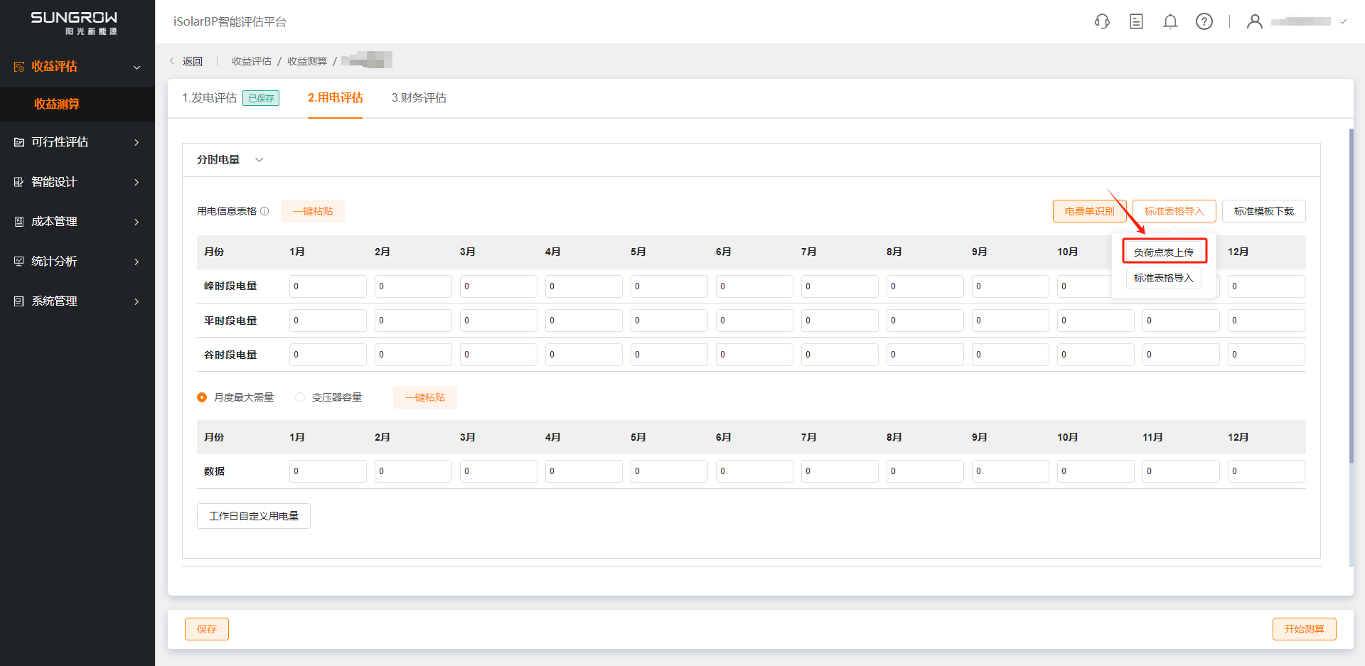 分时电量支持通过电费单识别、负荷点表上传、标准表格导入或手动填写4种方式完成用电量评估。