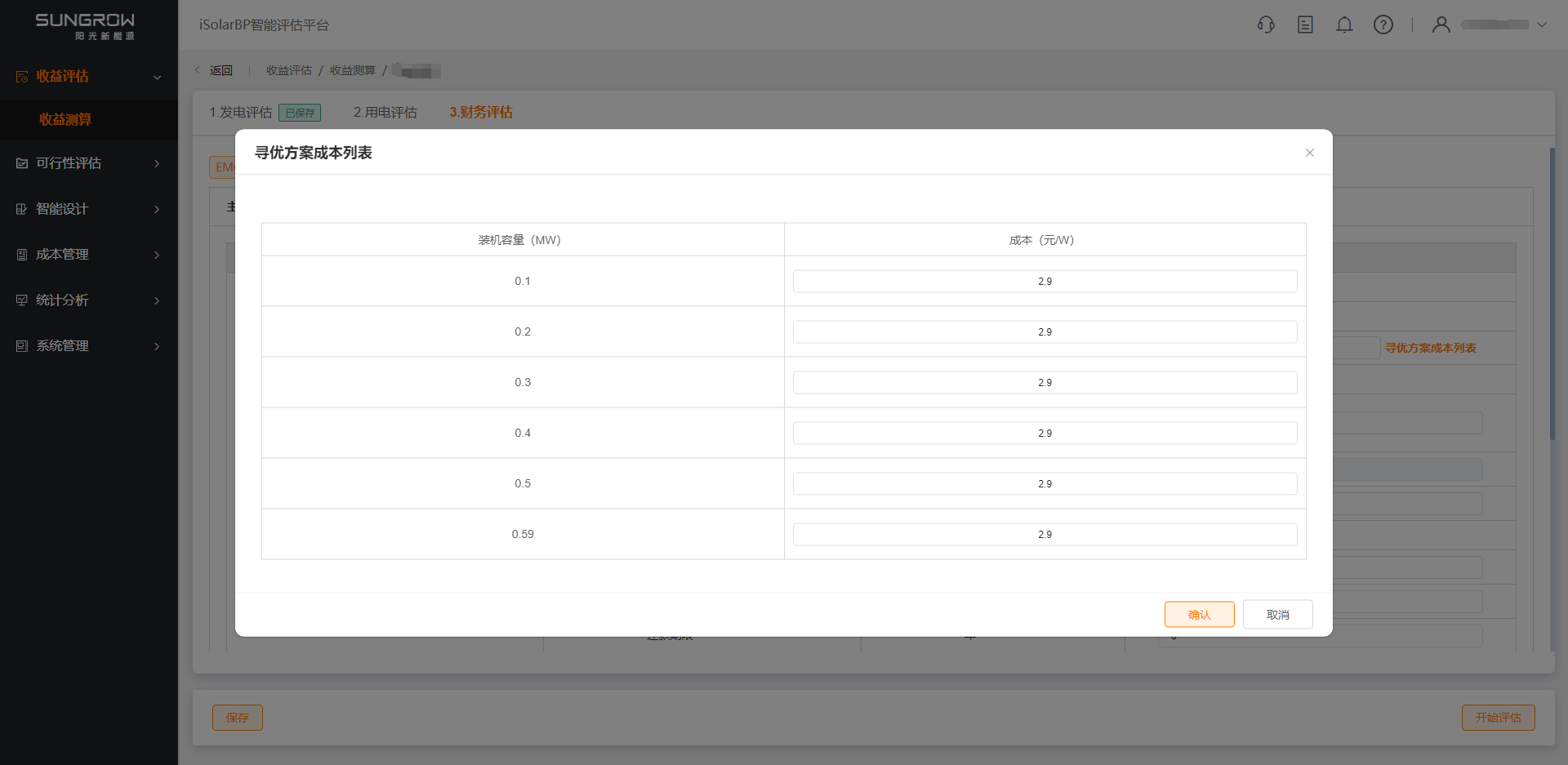 - 页面有 寻优方案成本列表 按钮,点击弹出寻优方案成本列表,可对寻优方案的成本进行调整