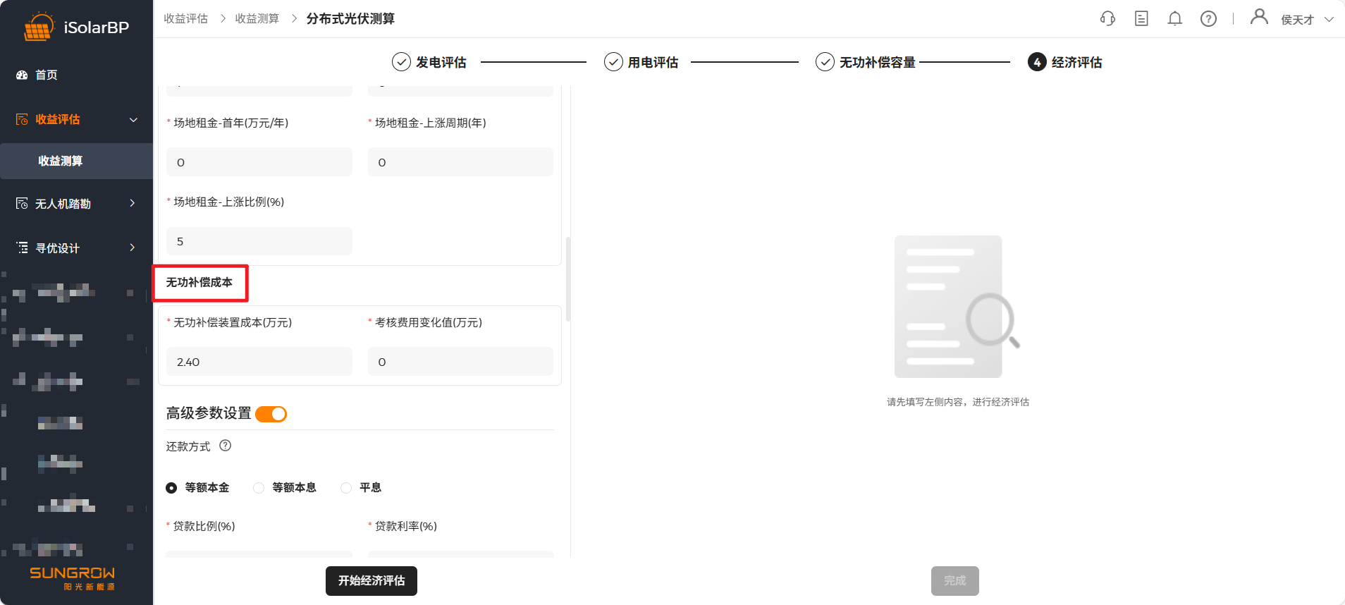 - 经济评估时会综合考虑无功补偿成本后计算最终的经济性,并在测算结果页面进行展示