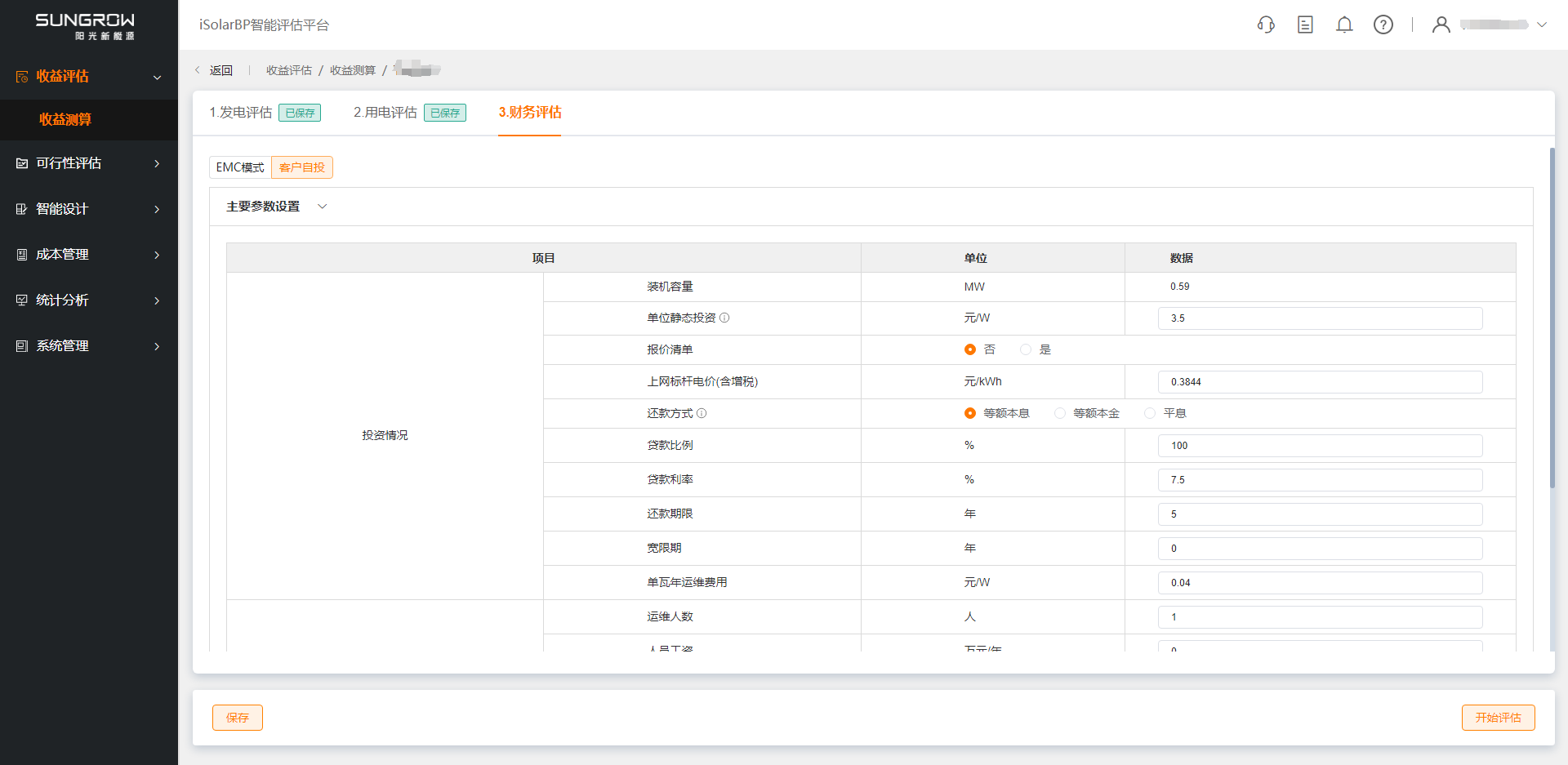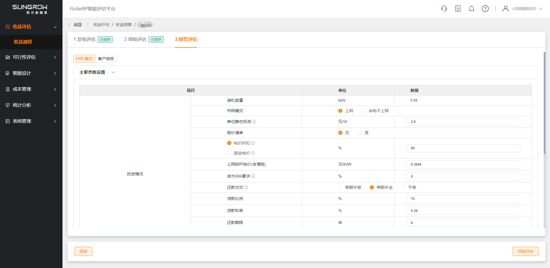 财务评估支持EMC模式和客户自投两种商业模式,系统已预设了参数默认值,可根据项目实际情况进行调整。