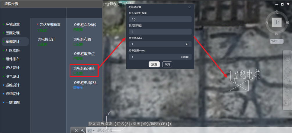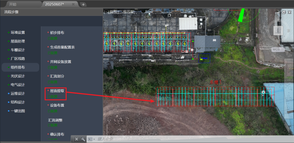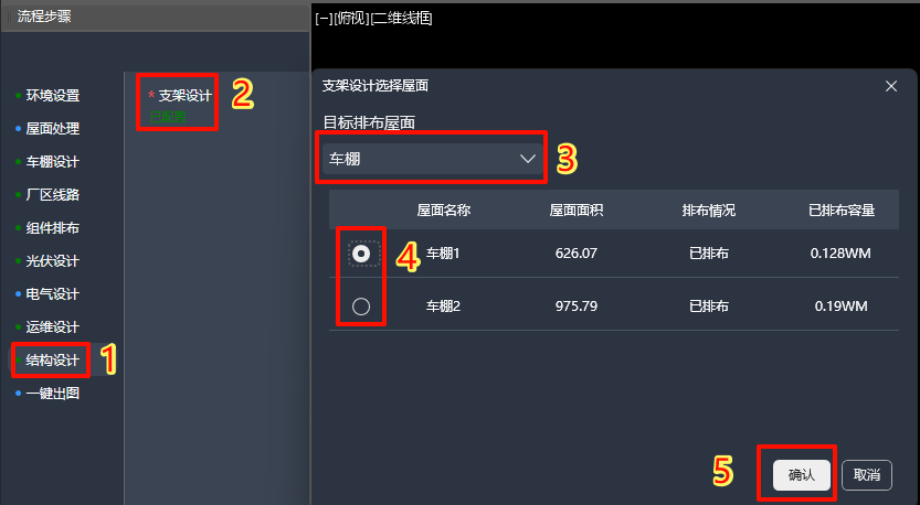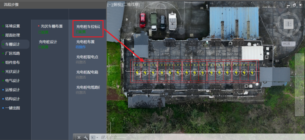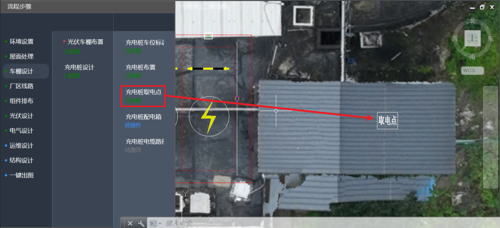 注意: 若只进行光伏车棚设计,可跳过“屋面处理”下各流程,在指北针设置、并网区域标识后,即可进行车棚设计