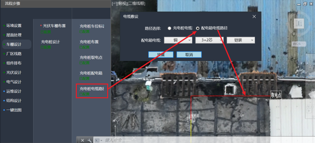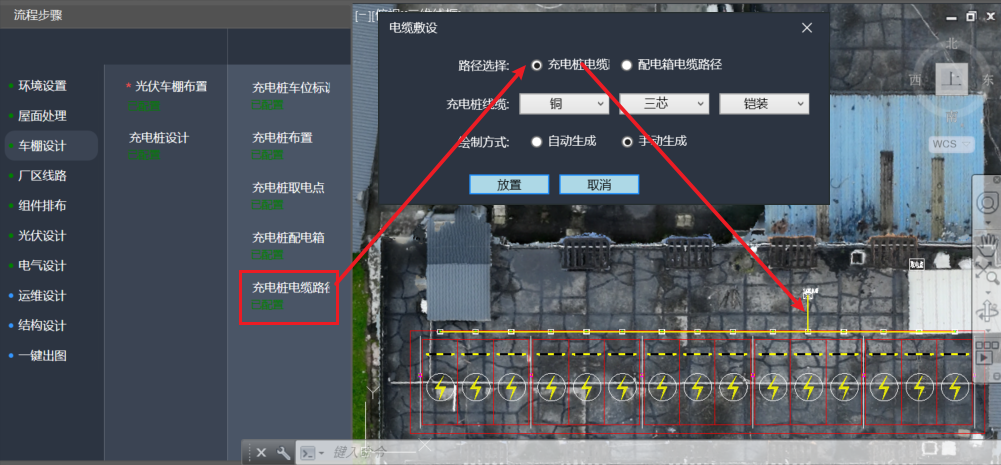 注意: 若只进行光伏车棚设计,可跳过“充电桩设计”流程,在“厂区线路”中的“光伏线缆路径”操作完毕后,即可进行车棚组件排布。