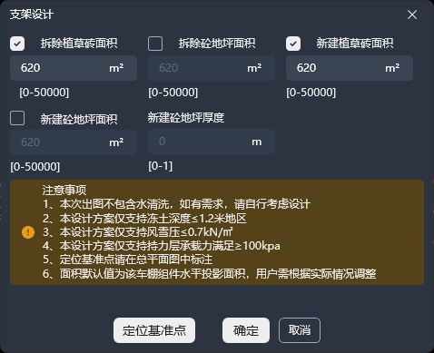 | 新建植草砖面积 | 默认值为选择的车棚所有基坑底面积和,勾选后可更改,范围:0~50000,单位:㎡ |