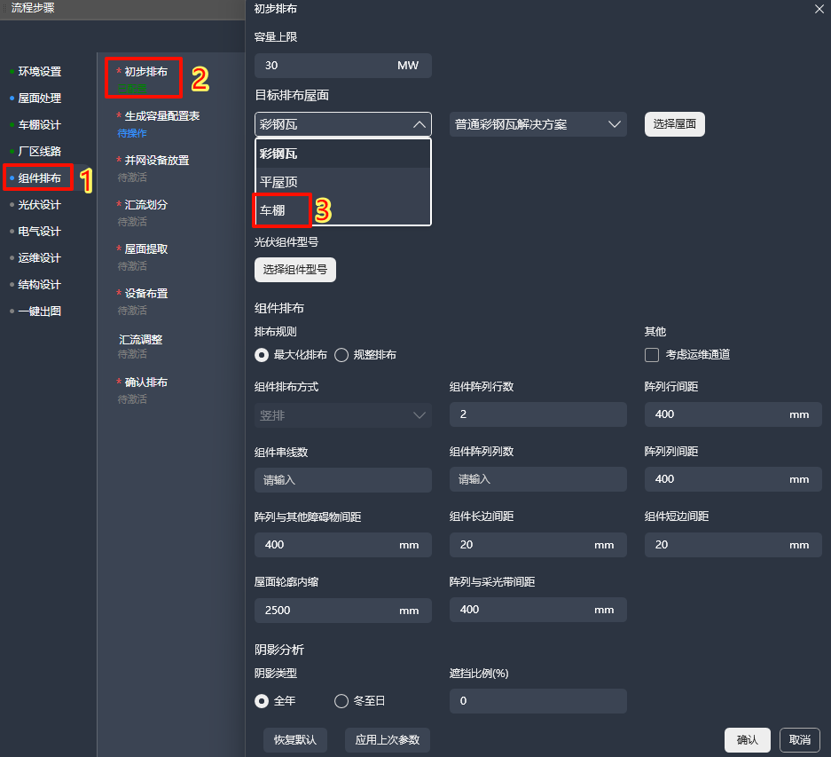 依次点击菜单栏中的“组件排布”、“初步排布”,进入车棚组件排布对话框,在“目标排布屋面”栏点击屋面类型下拉框,选择“车棚”。此时界面会刷新,然后点击“选择屋面”选取想要排布组件的屋面,此时软件会自动筛选出符合车棚类型的屋面名称。