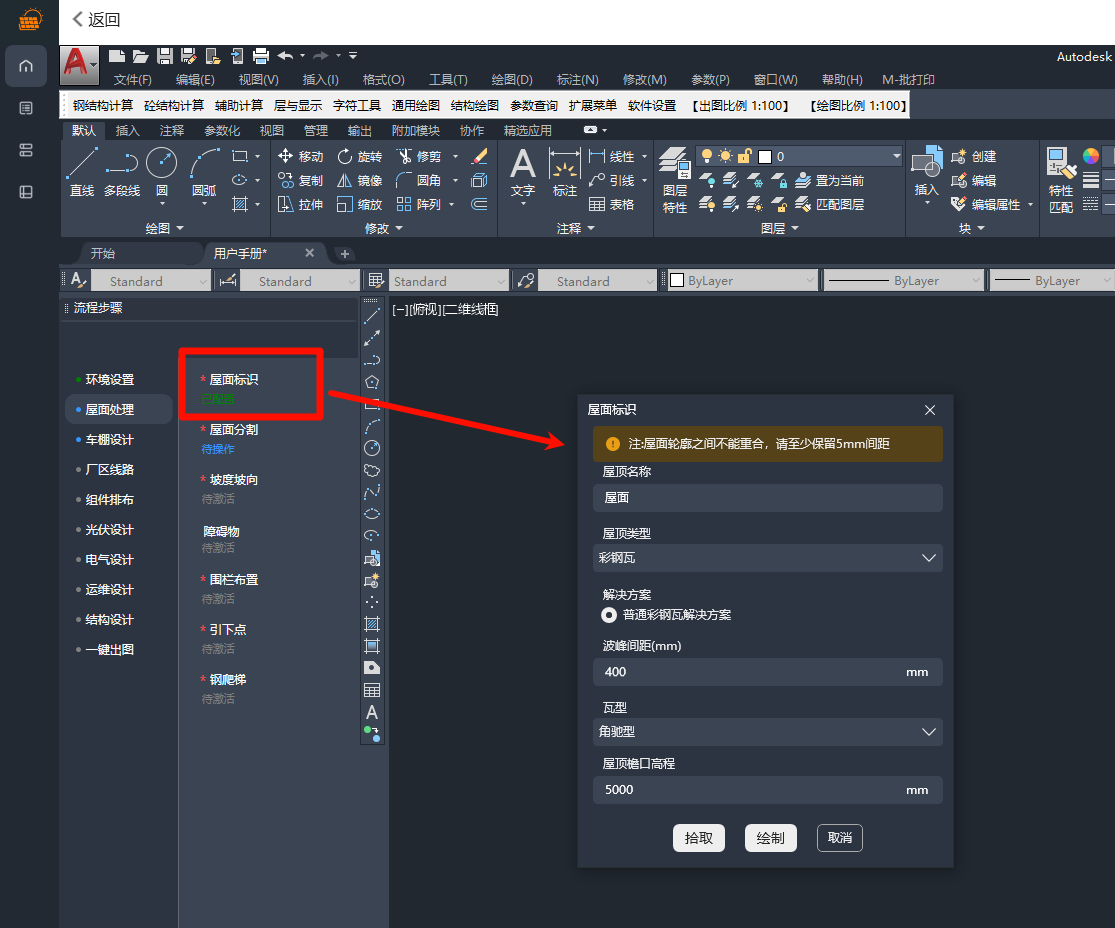 注意: 绘制或框选的线段必须在屋顶区域内部,与 屋面轮廓相交