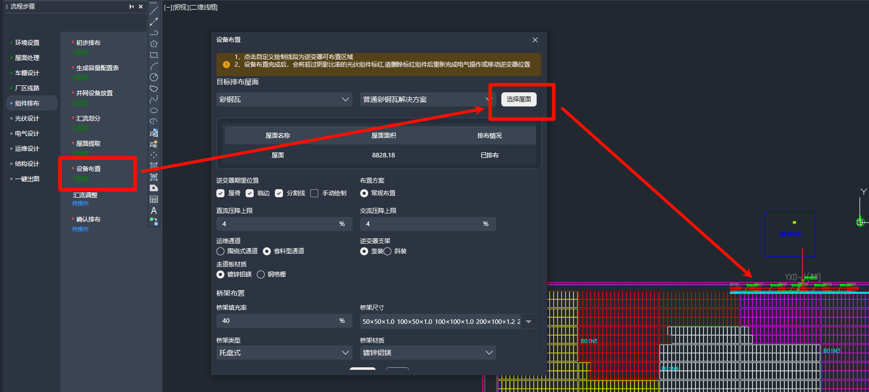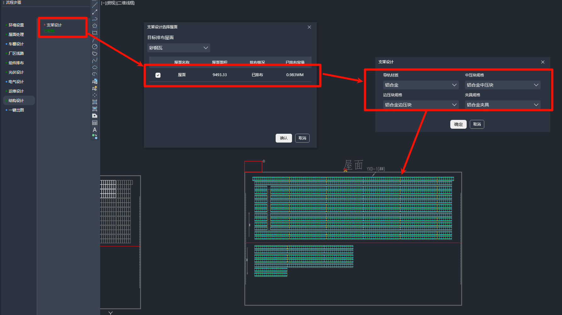 - 目标排布屋面类型选择彩钢瓦,勾选需要设计的屋面后展示导轨、压块、夹具规格材质,点击确认后即可生成支架设计图