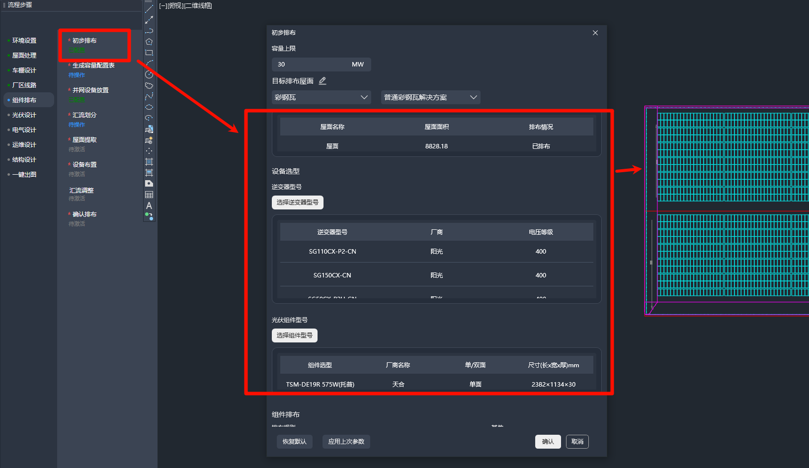 - 回显最终确认排布后的容量分配和汇流划分信息,确认后,按照该容量分配和汇流划分信息生成最终的组件排布