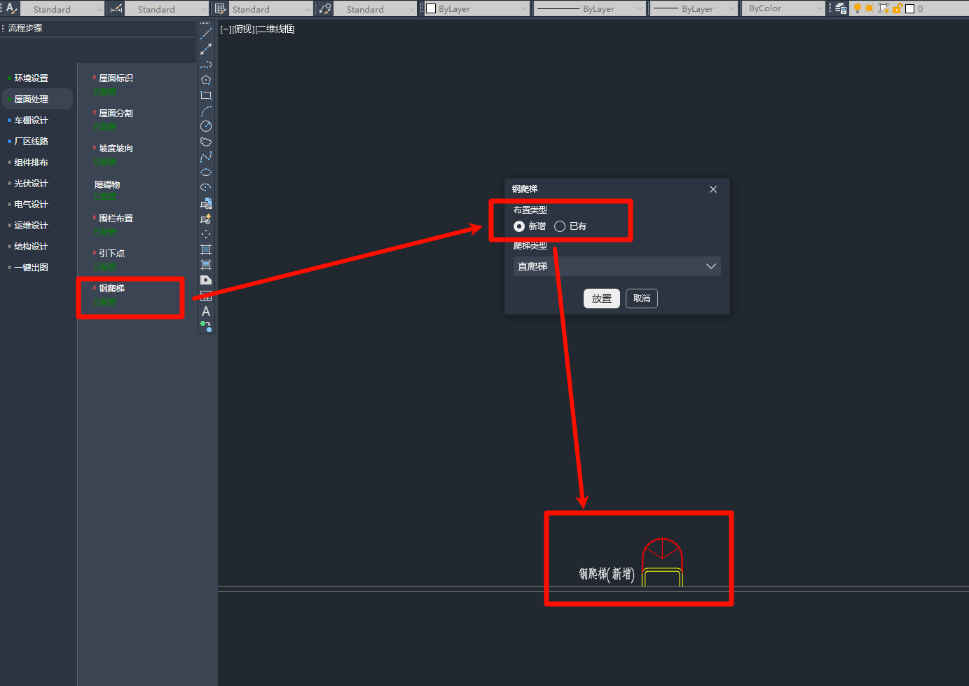 - 选择屋面外轮廓线,点击放置,屋面上即可出现钢爬梯图样