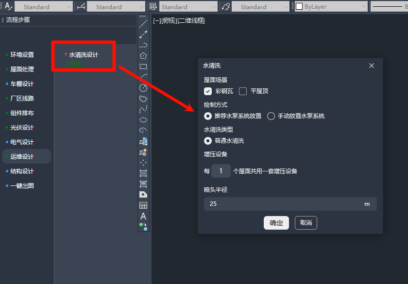 - 水清洗设计为屋顶的清洗单元的设计,包括水泵扬程、水管路径、喷头布置等,软件均内置寻优算法,给出最优设计结果,输出水工图纸与清单