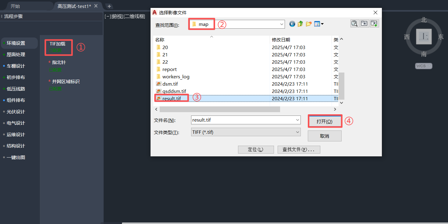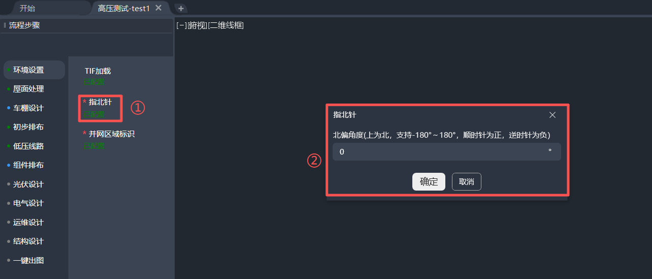 - 指北针用于阴影分析,若已上传TIF,则指北针默认指向TIF的正北方向,即北偏角度为0°