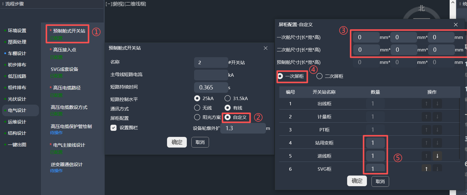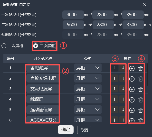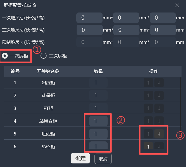 自定义,点击自定义,系统弹出自定义屏柜配置弹窗,由用户输入一、二次舱尺寸,一次屏柜配置,二次屏柜配置等- 自定义模式如下图所示: