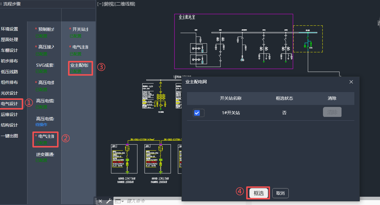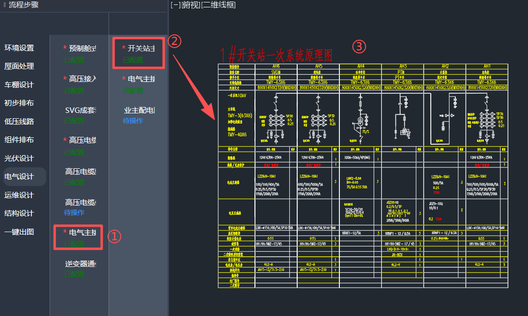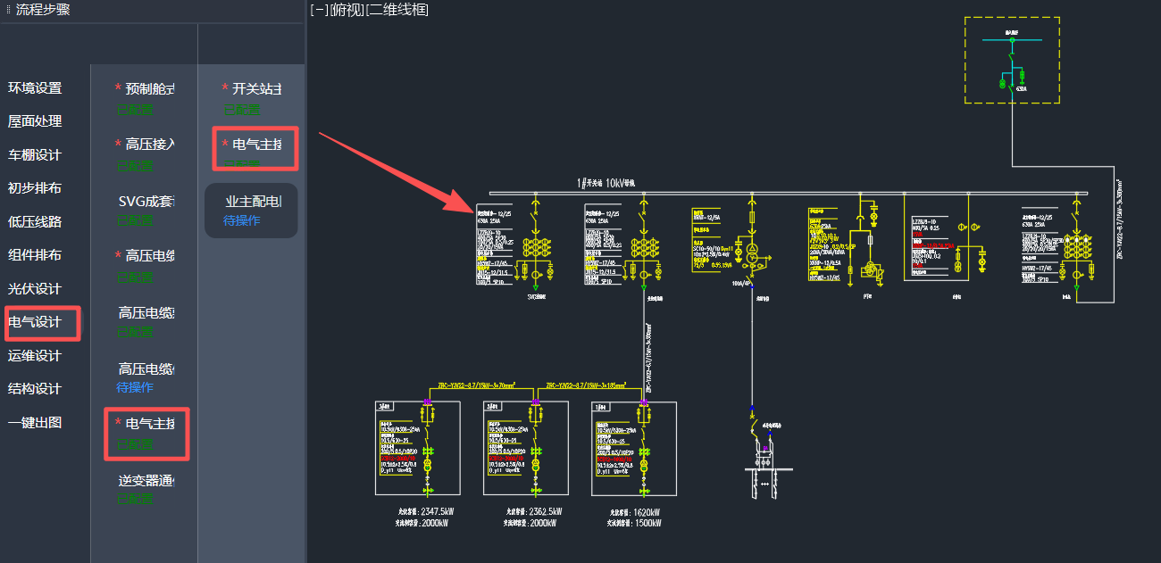 - 业主配电网,根据预制舱式开关站布置中配置的一次屏柜数量,以及箱变、开关站、SVG和高压接入点间连接关系,自动生成高压一次电气主接线图,并自动计算高压电缆选型以及动稳定性和热稳定性校验;