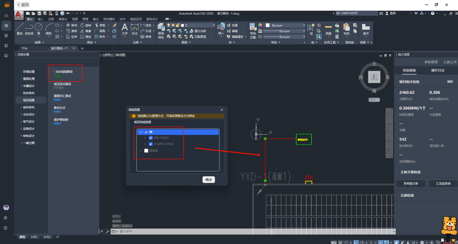 - 桥架校验用于校验手动绘制的直流桥架路径,以及桥架的规格型号,计算线缆型号及压降