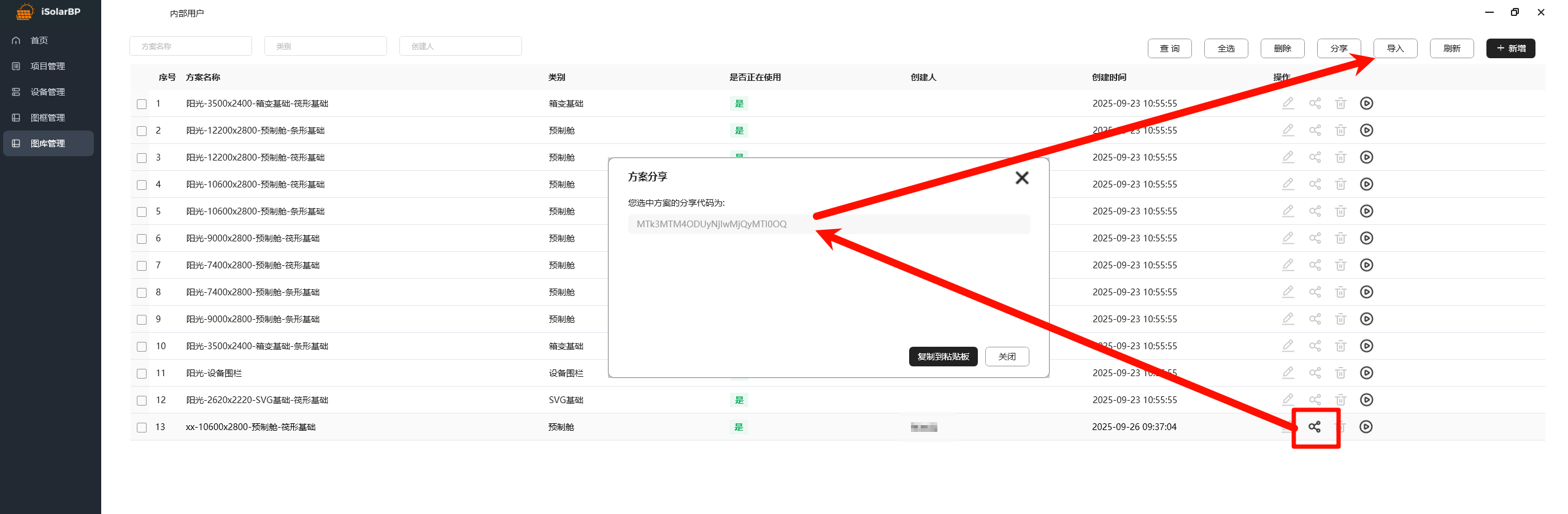 分享按钮,生成分享代码,其他用户在软件中导入分享代码,即可将当前图库分享给其他用户,进行出图与清单统计