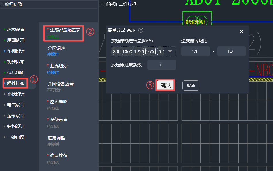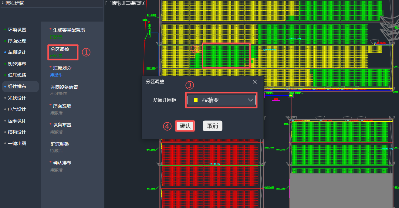 - “箱变备选区域放置”用于在厂区中框中箱变放置区域,在项目初始阶段,完善项目周围环境信息,明确厂区内箱变可放置位置,箱变备选区域可放置多个,具体放置个数由用户根据厂区道路情况决定