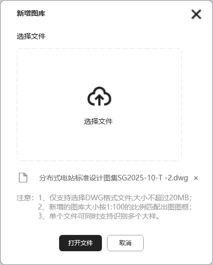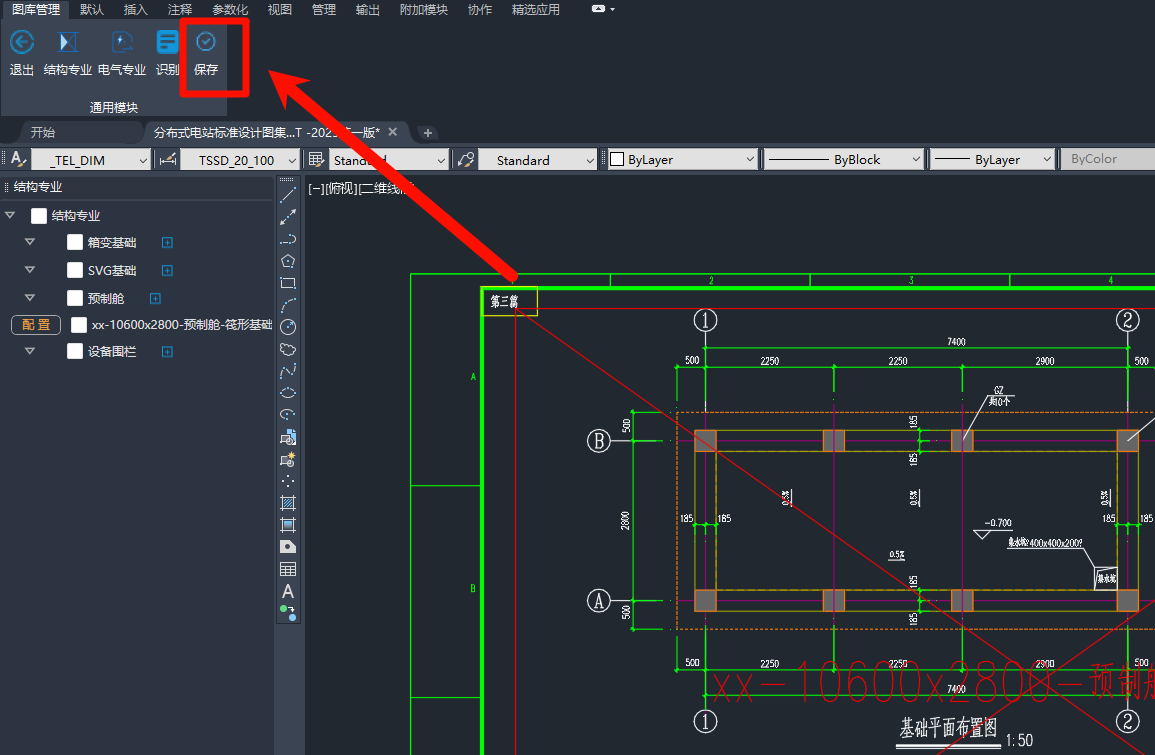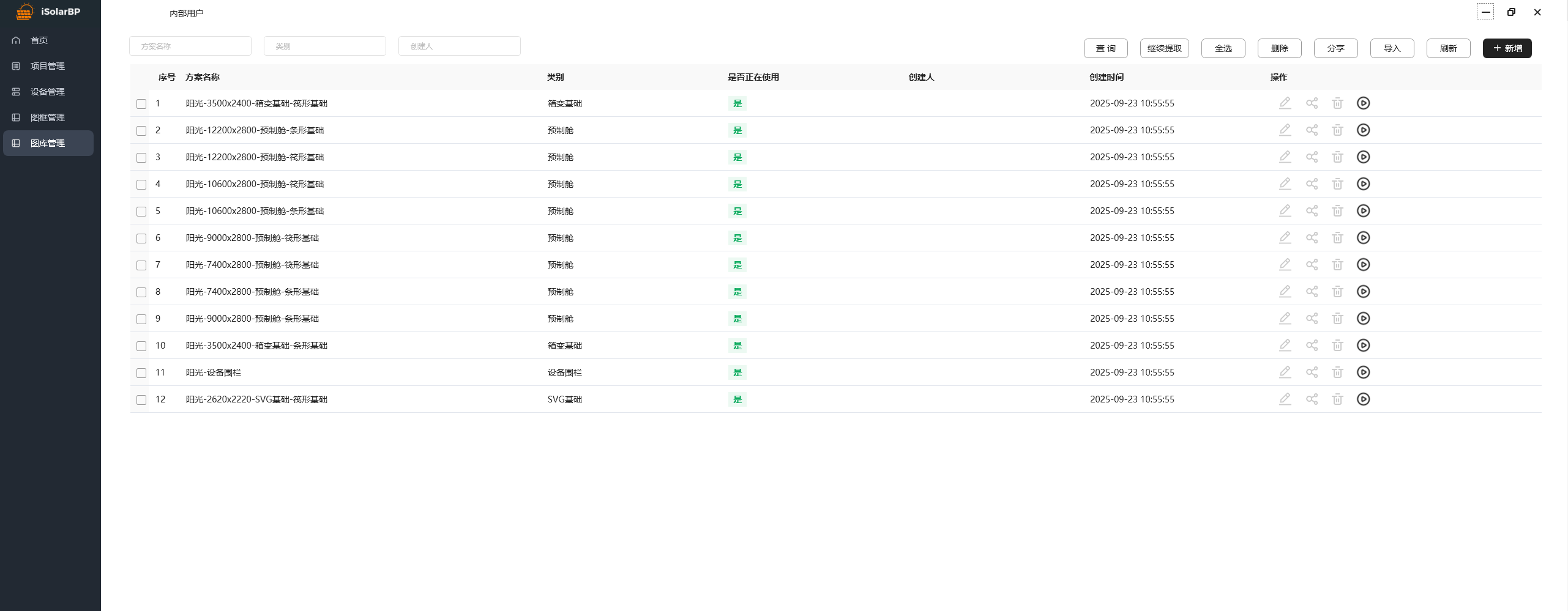 高压场景结构设计相较于低压场景,额外增加预制舱、箱变、SVG等高压设备基础,由于高压设备尺寸不一,且资方、业主要求不一,很难形成典设方案,因此结构设计提供高压设备图库管理功能,支持用户自定义上传图纸