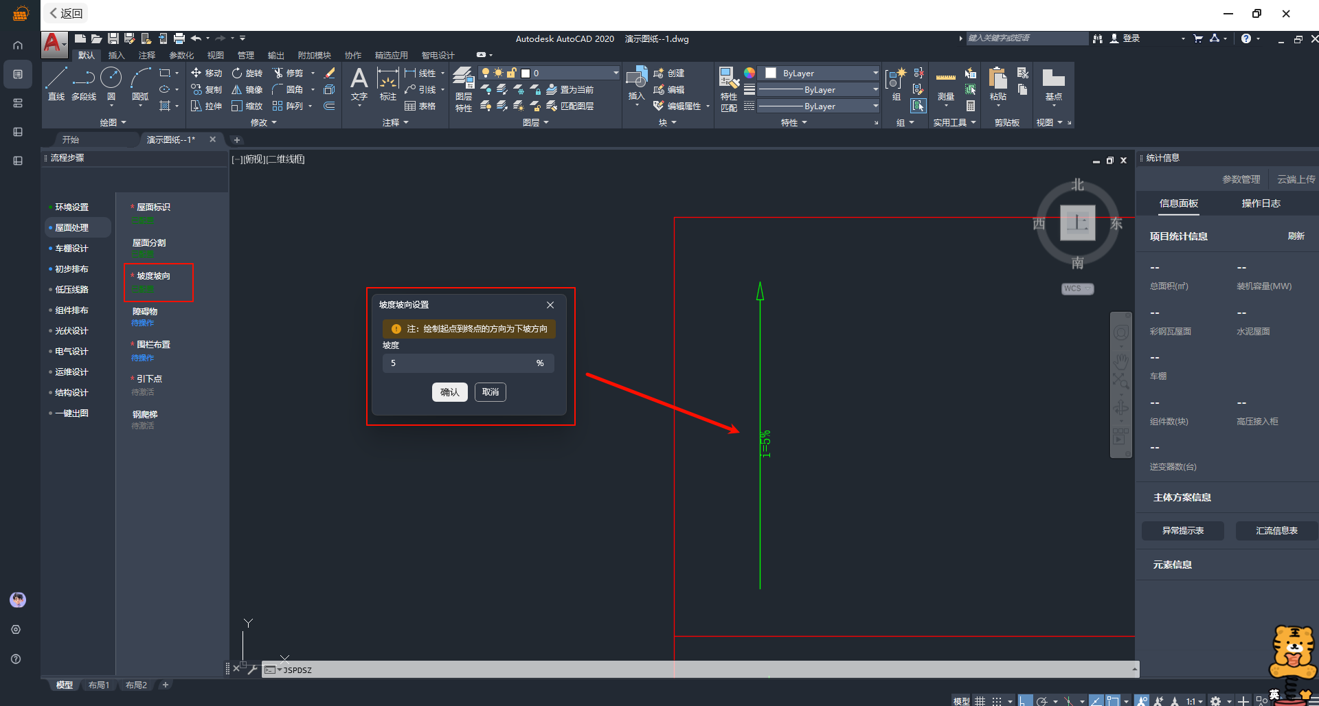 “坡向坡度”用于标识屋面坡度及确认屋顶高低点,坡度不同阴影分析也不同