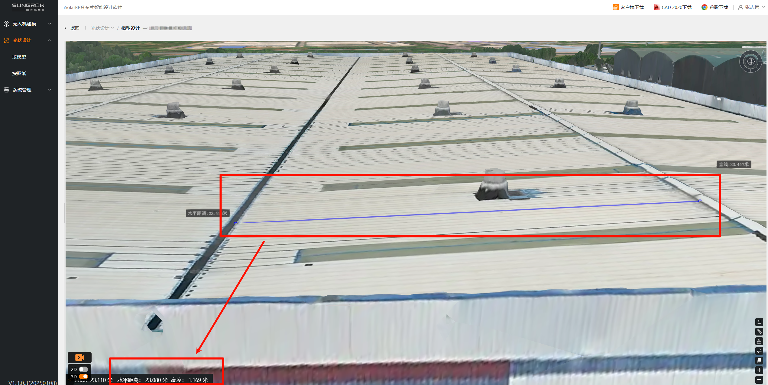 - 坡向坡度可在iSolarBPweb端三维模型中测量计算获得:在三维测量中选取屋脊线到檐口上两点,软件会自动给出两点间相对高度与水平距离,相对高度与水平距离的比值即为屋面坡向坡度值