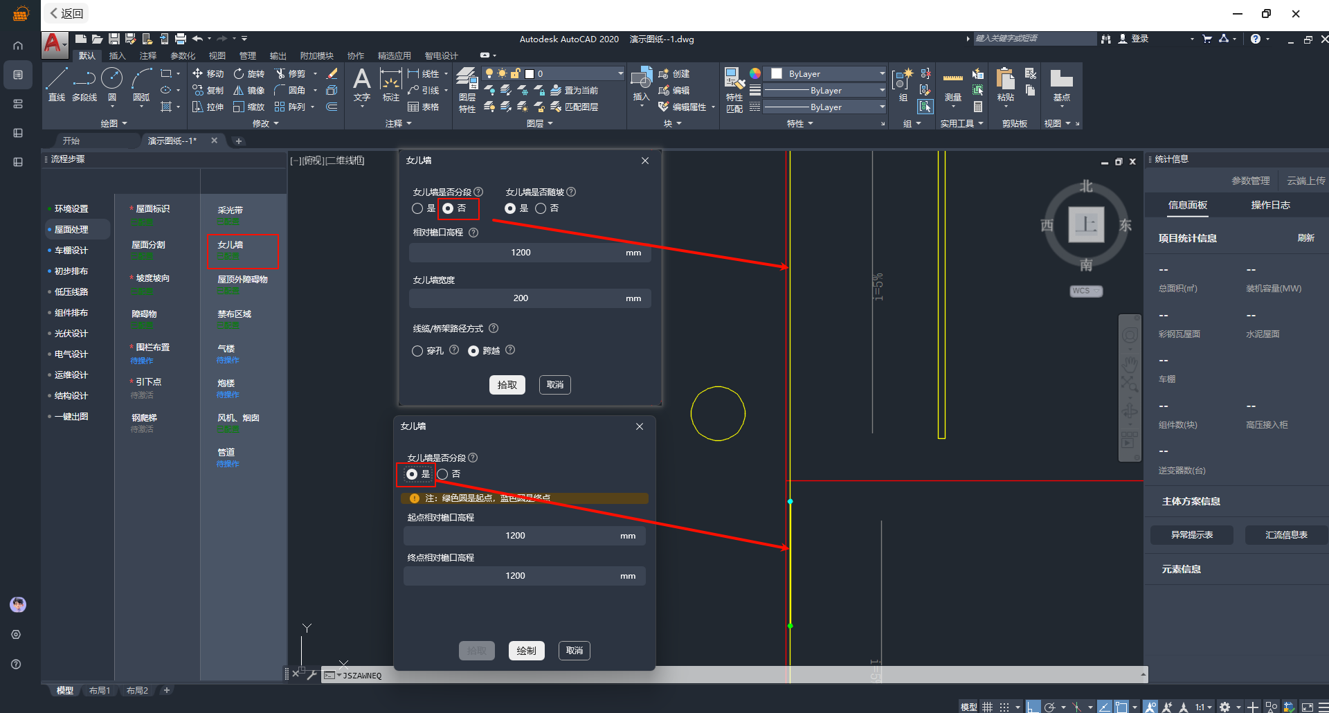 2)女儿墙随坡选择女儿墙随破时,坡度与屋面坡度保持一致,女儿墙高度为相对屋面檐口的高度