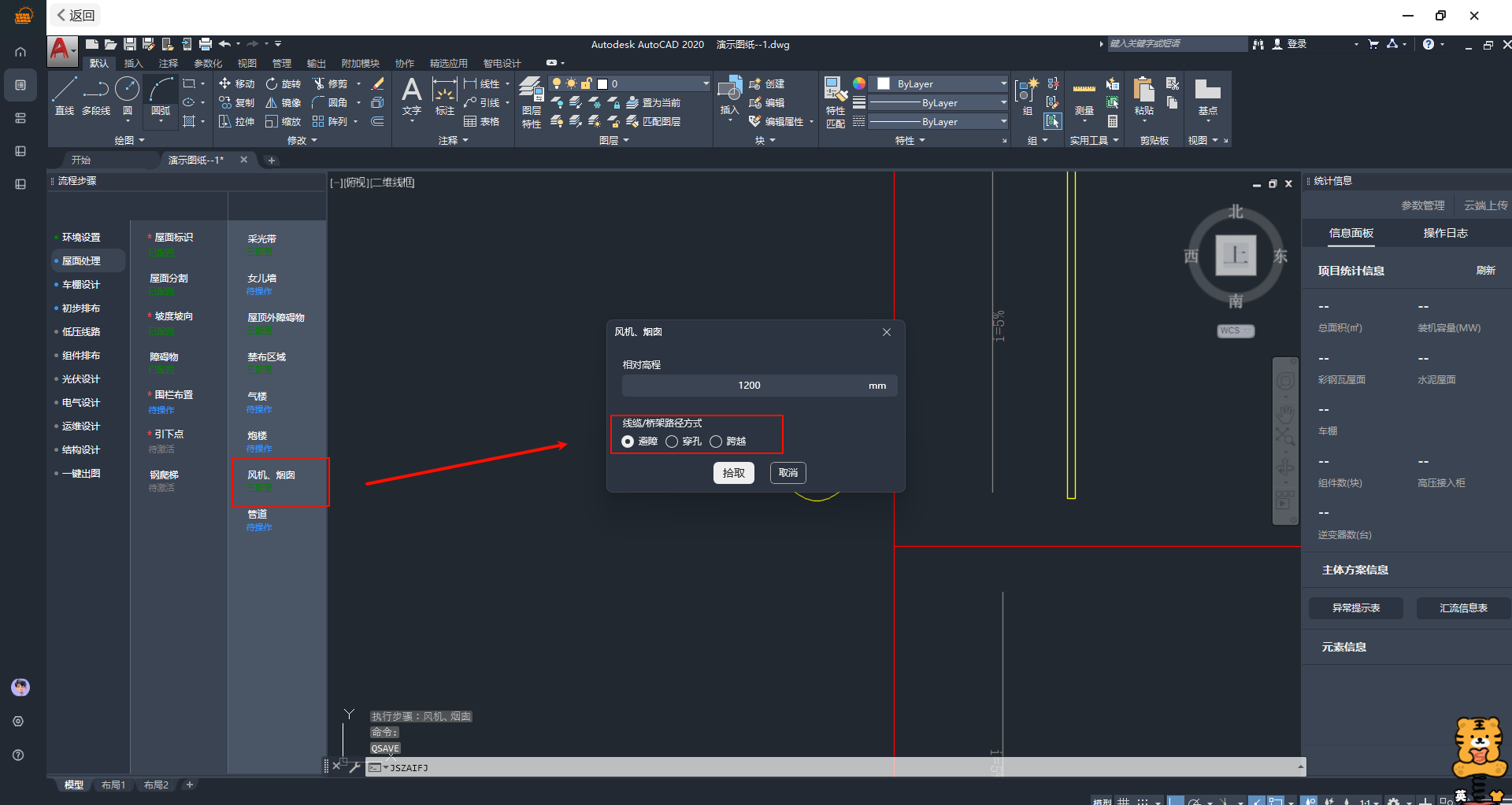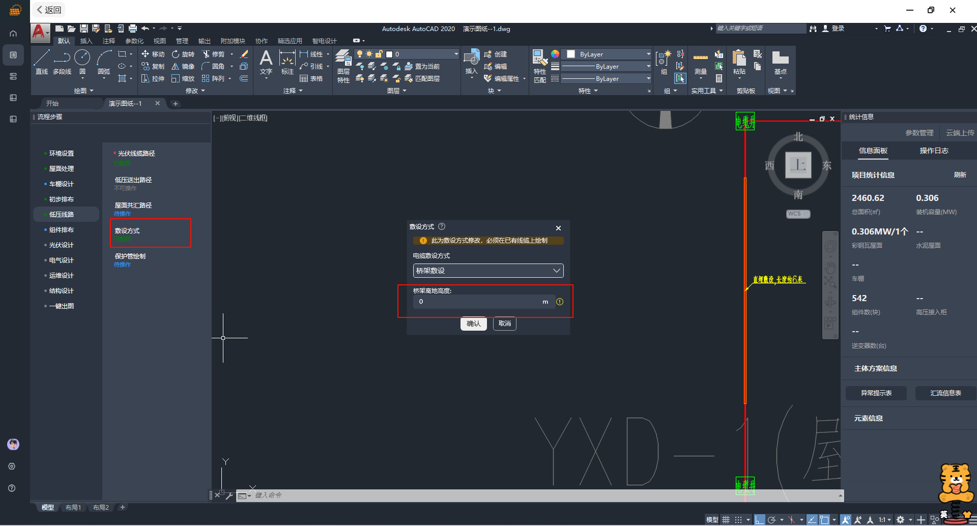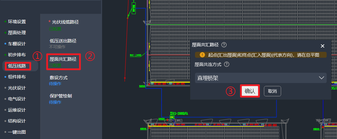 “桥架敷设”只适用于屋顶外部高压线缆的敷设- 桥架离地高度用于:屋面外交流桥架跨越障碍物时,可设置该值,该值可为负数,标注后软件自动计算落差高度并统计桥架及线缆长度
