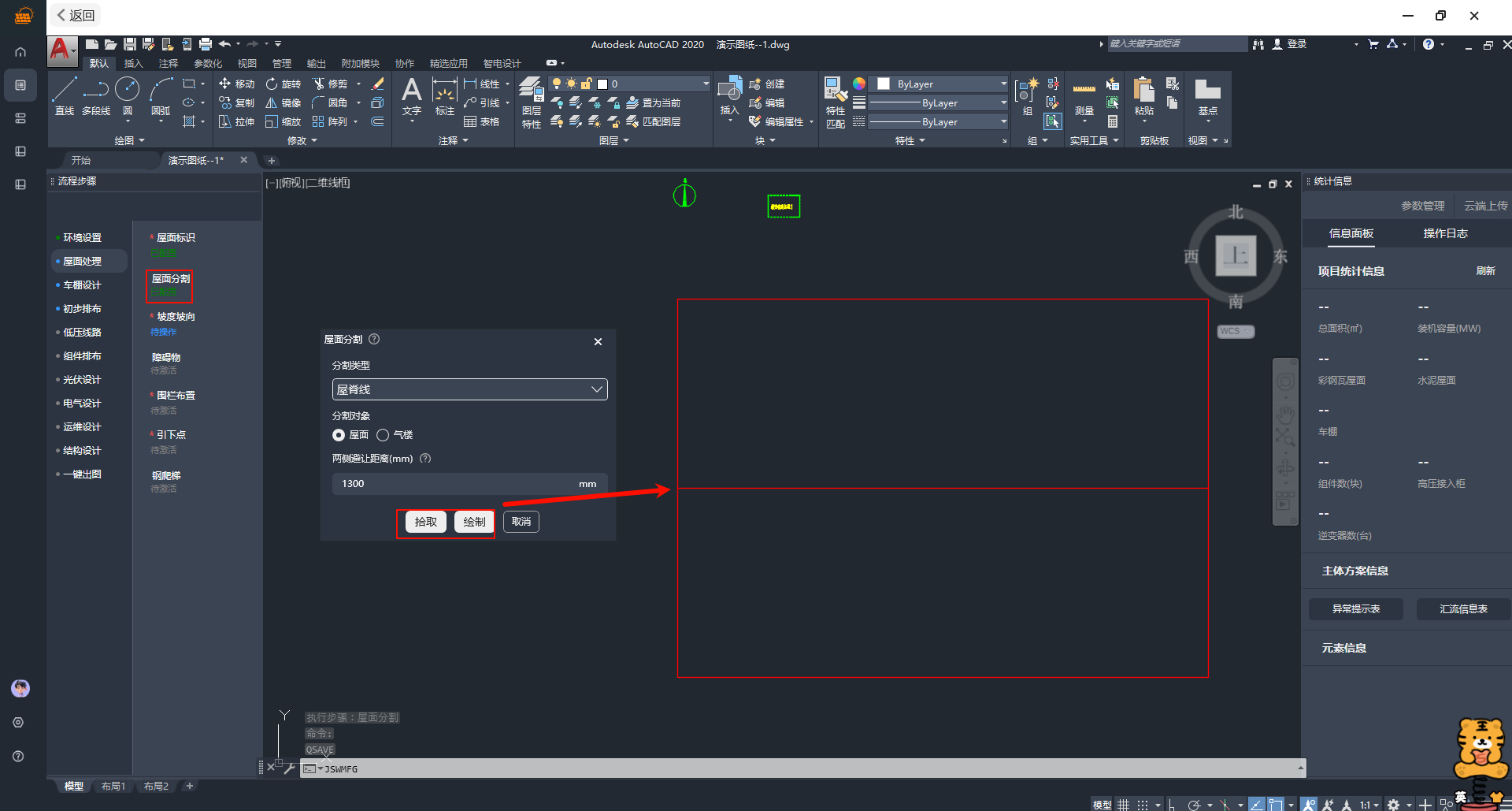 “屋面分割”用于标识单个屋面的屋脊线和相邻屋面间的分割线,屋脊线及分割线影响阴影分析、组件排布、自动串线等功能