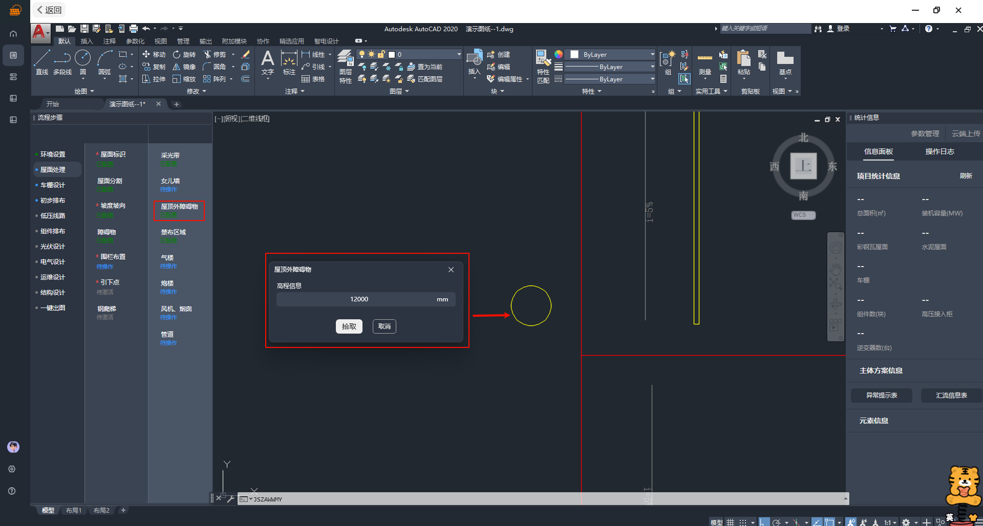 屋顶内障碍物,如采光带、风机、气楼等,相对高程以屋面高程为起点(单位:mm),需在屋面轮廓内设置,设置完成后轮廓线变黄