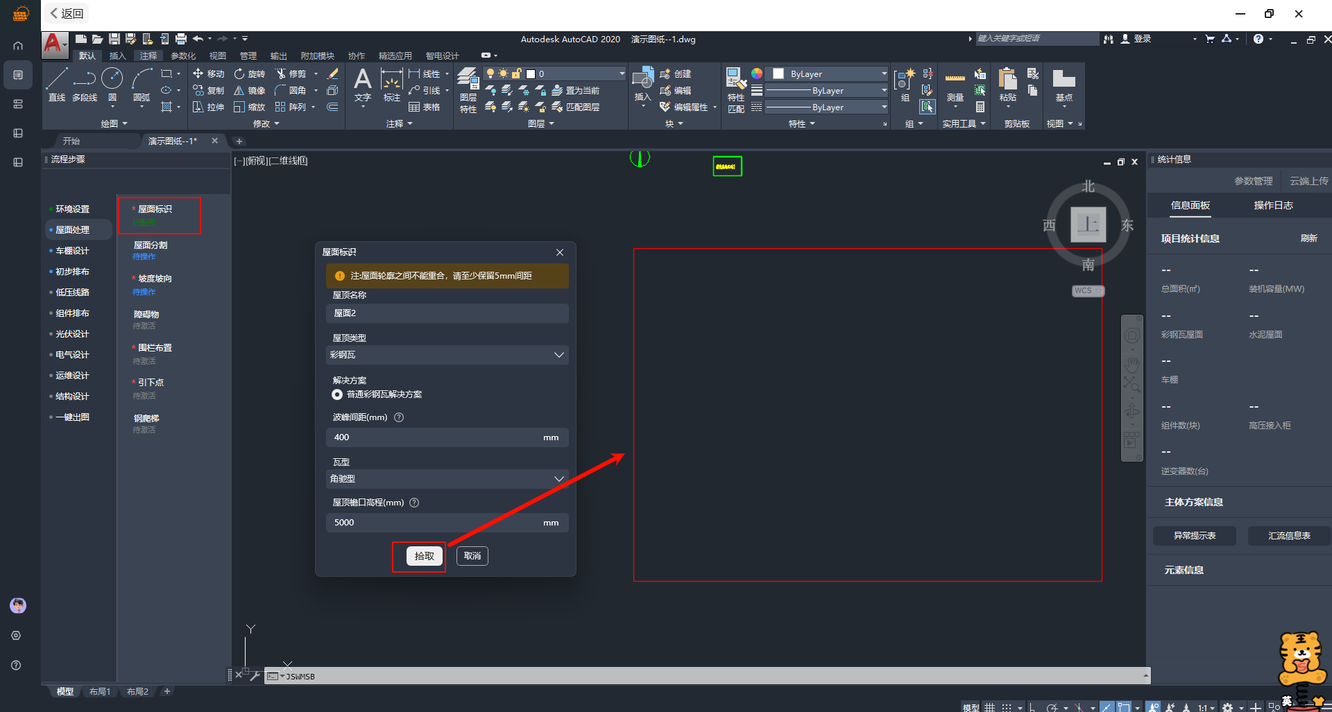 注意: 绘制或框选的线段必须在屋顶区域内部,与 屋面轮廓相交