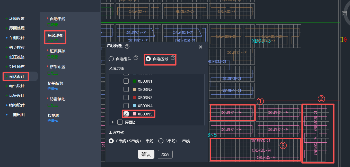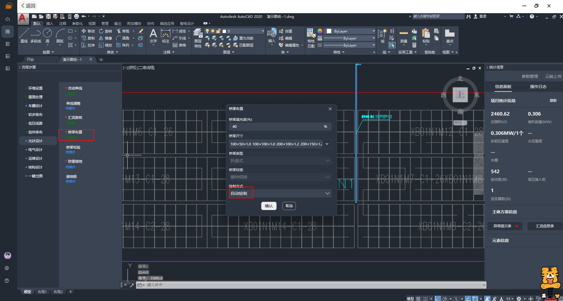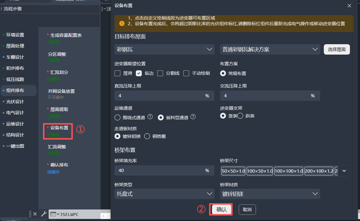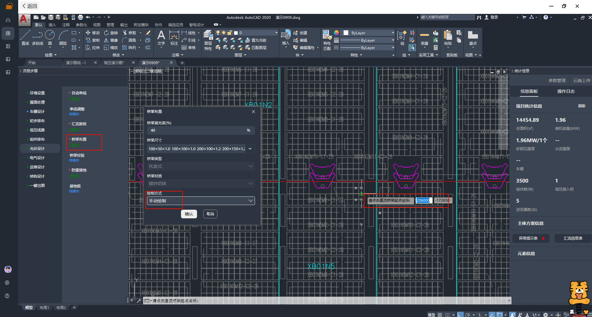 自动布置,点击确定,系统自动绘制直流桥架路径,自动对桥架型号选型手动布置,下拉框选择手动布置,点击确定,手动绘制直流桥架,路径需连接逆变器和对应汇流区- 手动布置效果如下图所示: