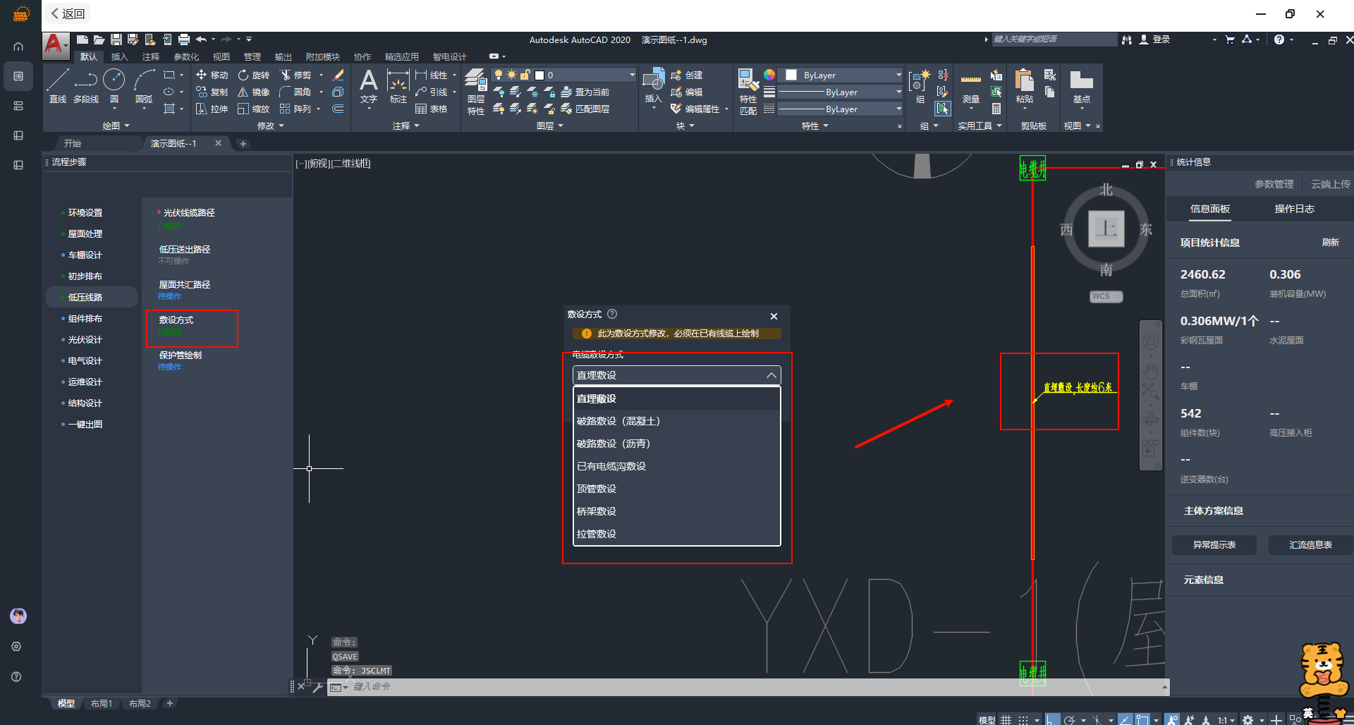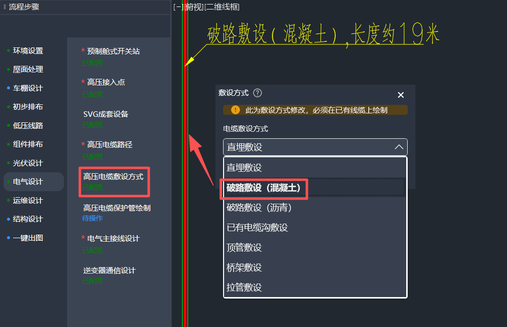 - 下拉框选择敷设方式在已绘制的高压电缆上标注敷设方式的起点终点