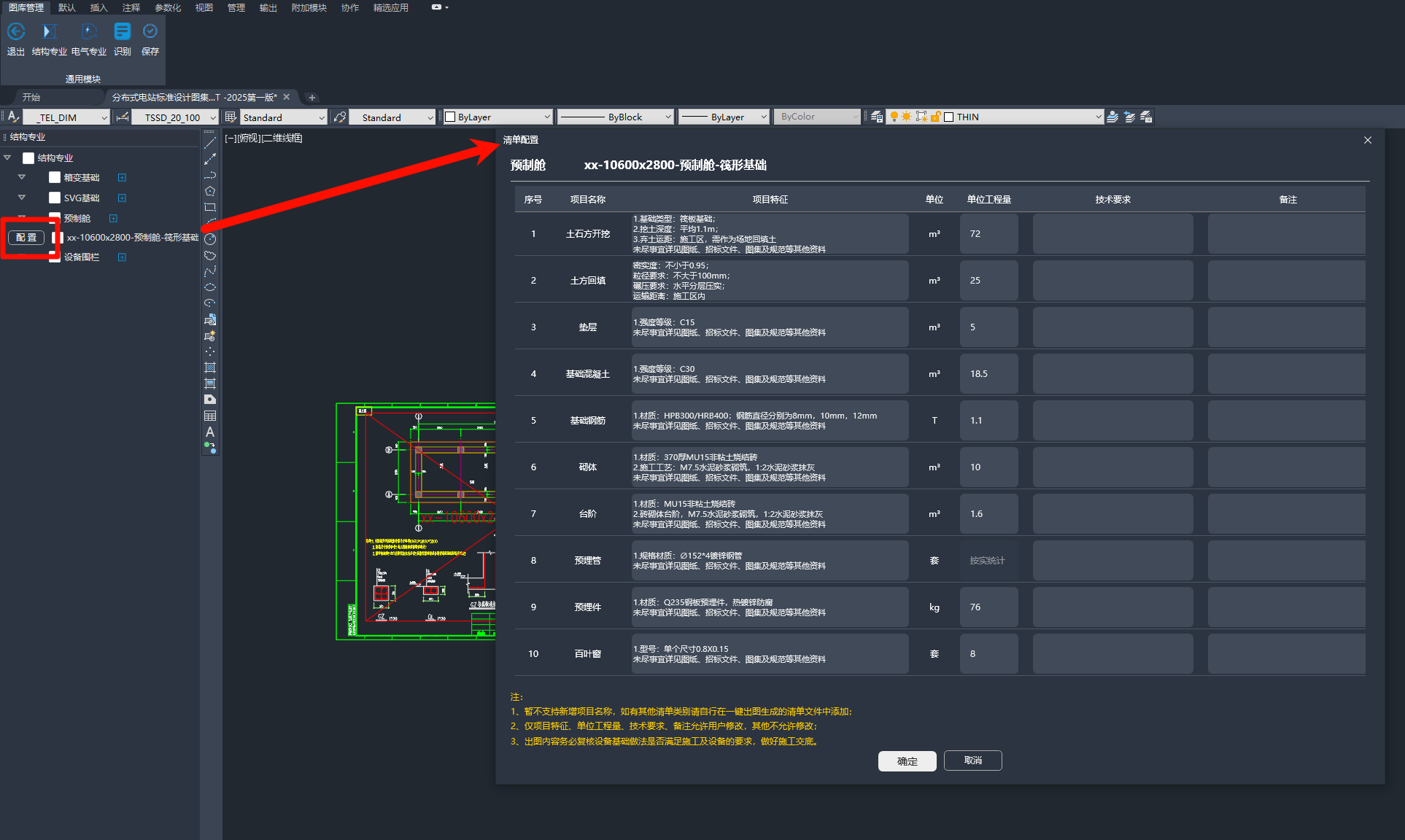 配置即可开始清单配置功能 - 软件给出默认单位工程量,可手动修改,技术要求、备注等信息也可手动输入,输入后清单中对应输出相应内容
