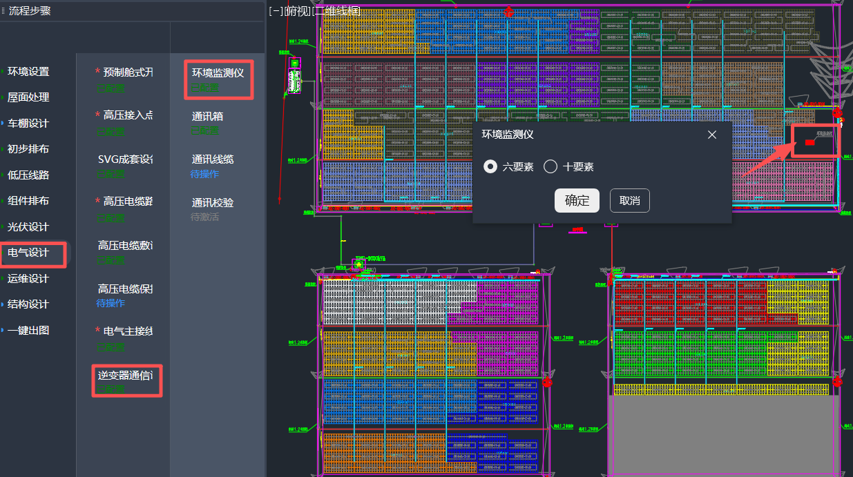 - 环境监测仪,点击环境监测仪,放置在总平图的彩钢瓦屋顶上,一个项目仅支持一个环境监测仪,环境监测仪分为十要素和六要素两种
