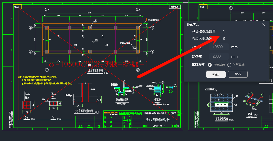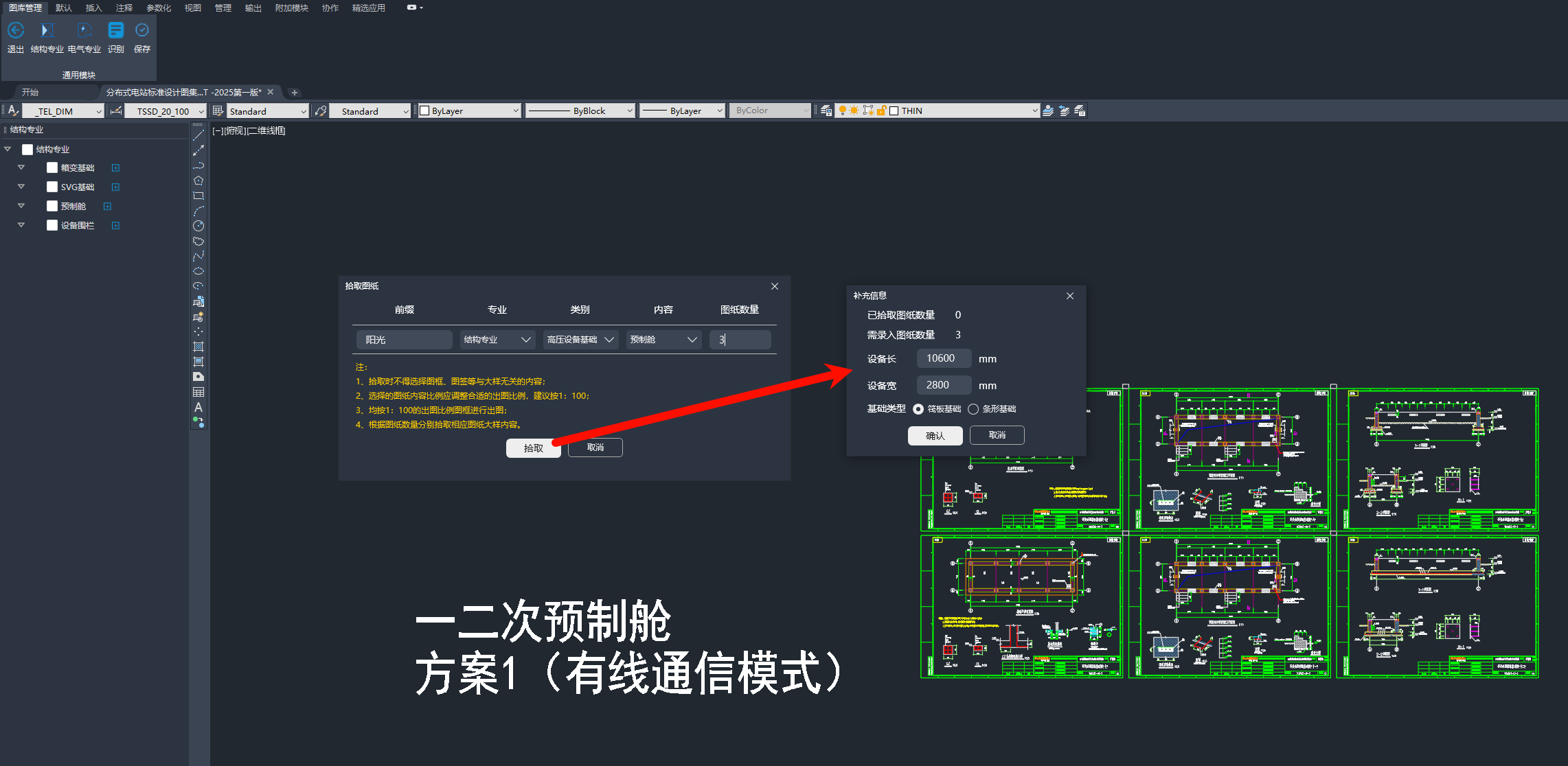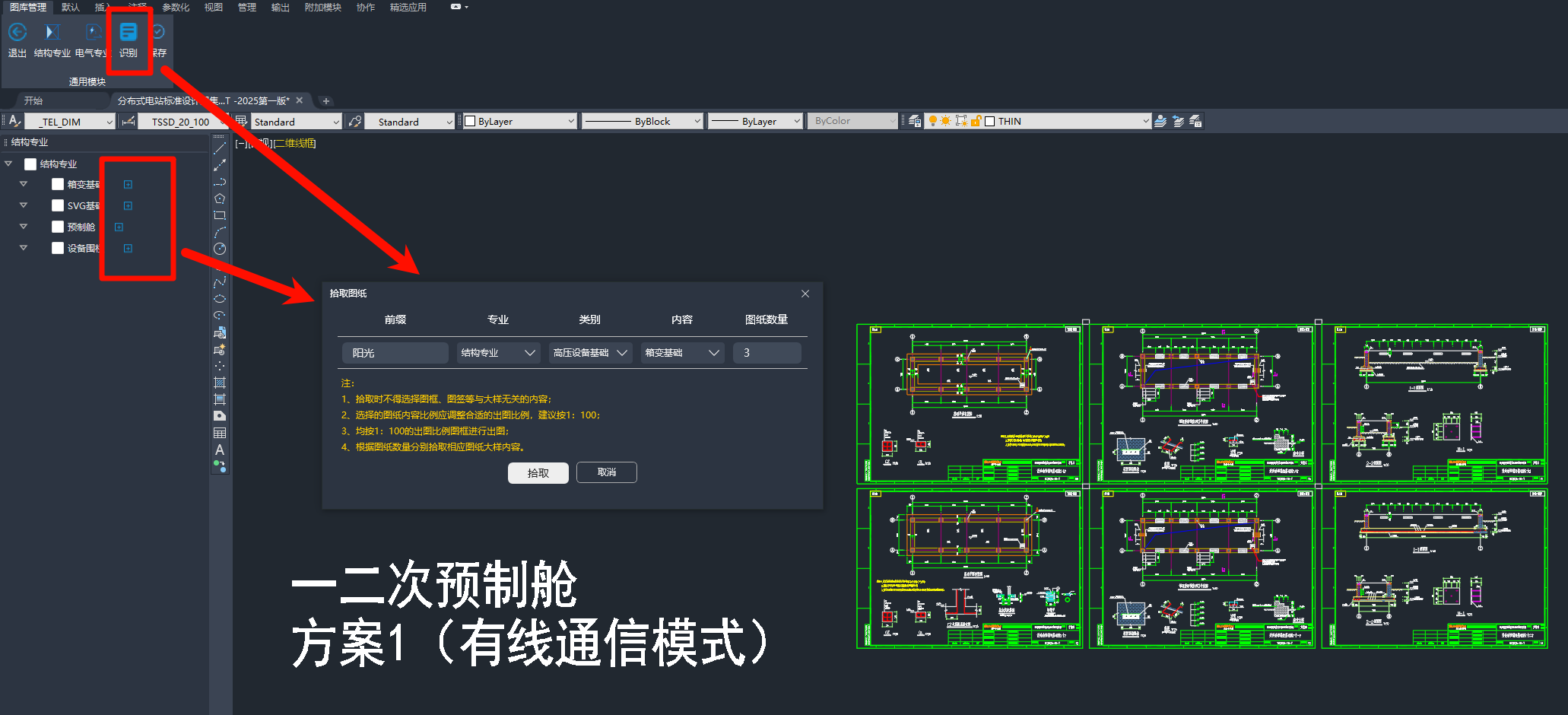 识别按钮,或者左侧结构专业的+,弹出拾取图纸,其中前缀为图纸名称前缀,选择结构专业——高压设备基础,内容包括箱变基础、SVG基础、预制舱、设备围栏,选择内容后输入该内容需要输出的图纸数量