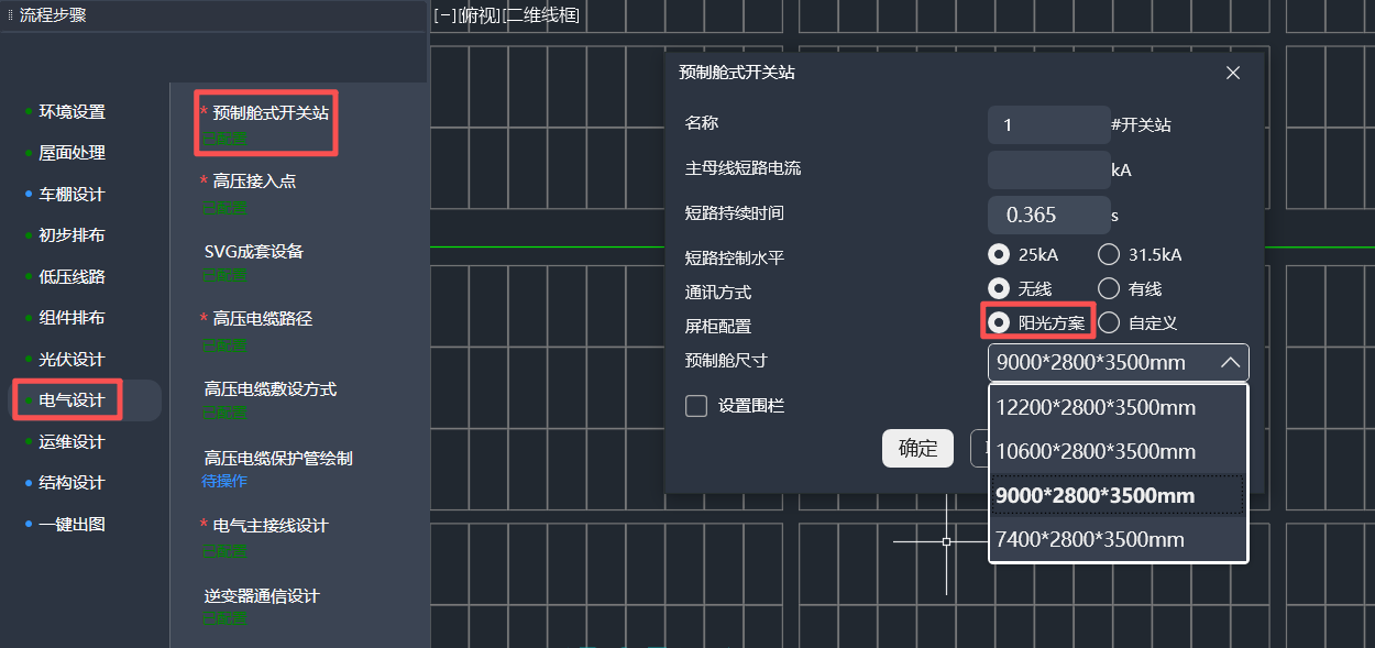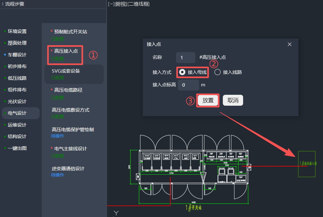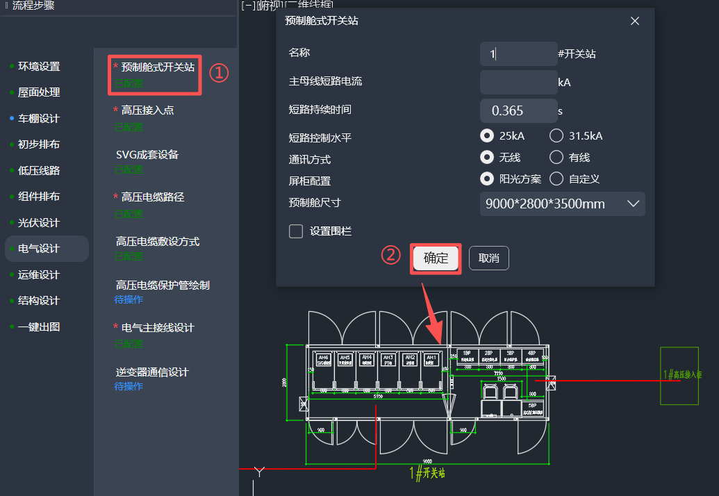 - 输入预制舱开关站相应参数,点击放置,在图中合适位置放置开关站