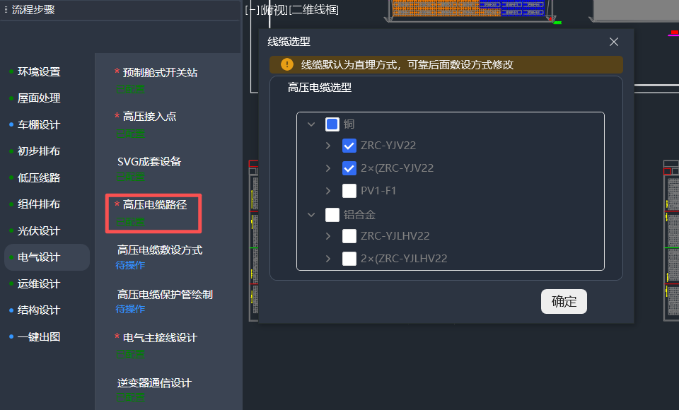 - 绘制前选择电缆的类型、型号,可多选,系统自动计算合理的电缆型号