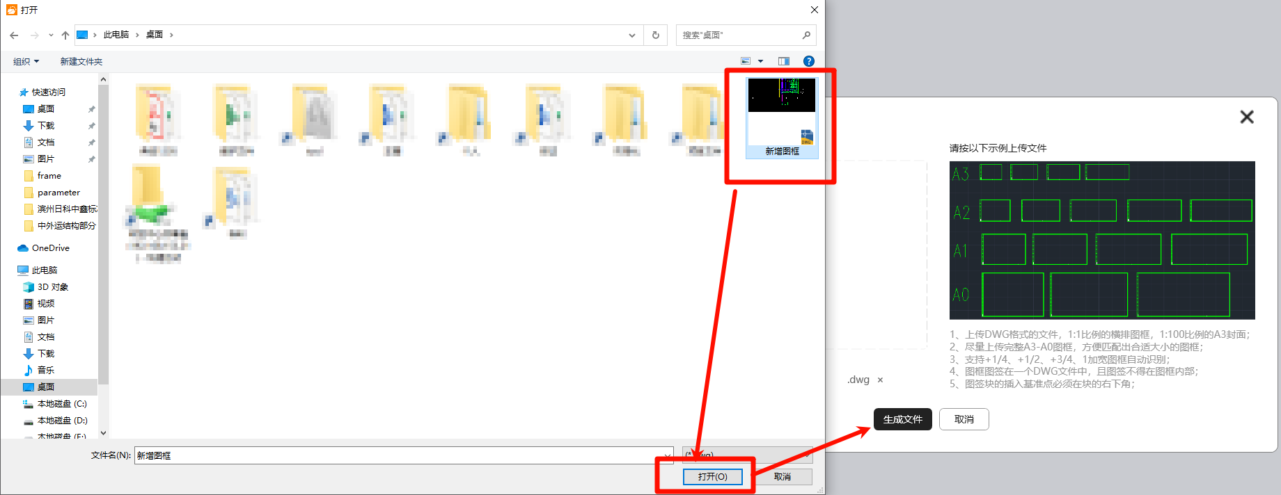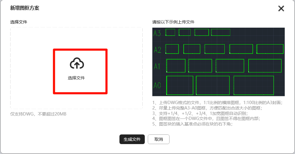 点击选择文件,打开文件目录,找到需要上传的DWG文件选中后点击"打开",然后点击生成文件,即可进图框编辑页面