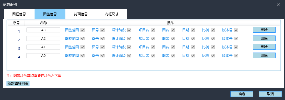 点击"图签信息—新增图签列表",可增加最多5个图签,图签名称可自定义
