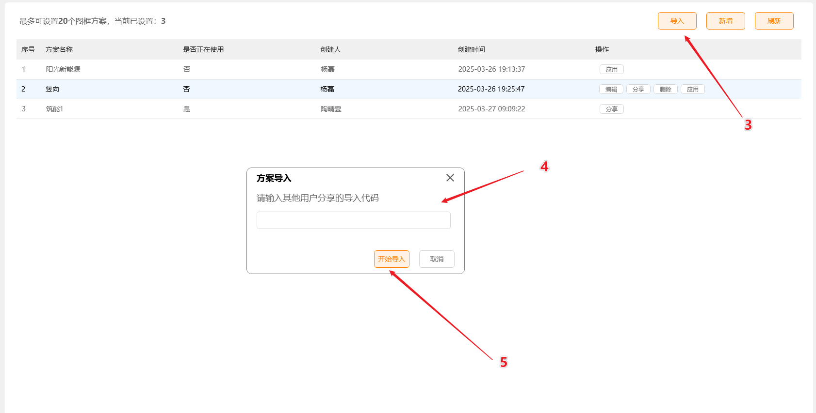 收到分享码,点击导入按钮粘贴好分享码,点击开始导入,点击应用即可应用别人分享的方案