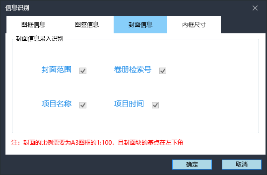 - 卷册检索号,项目名称,项目时间,必须在当前已框选的图签范围内框位置(非必须全设置,根据自身需求选择设置项)