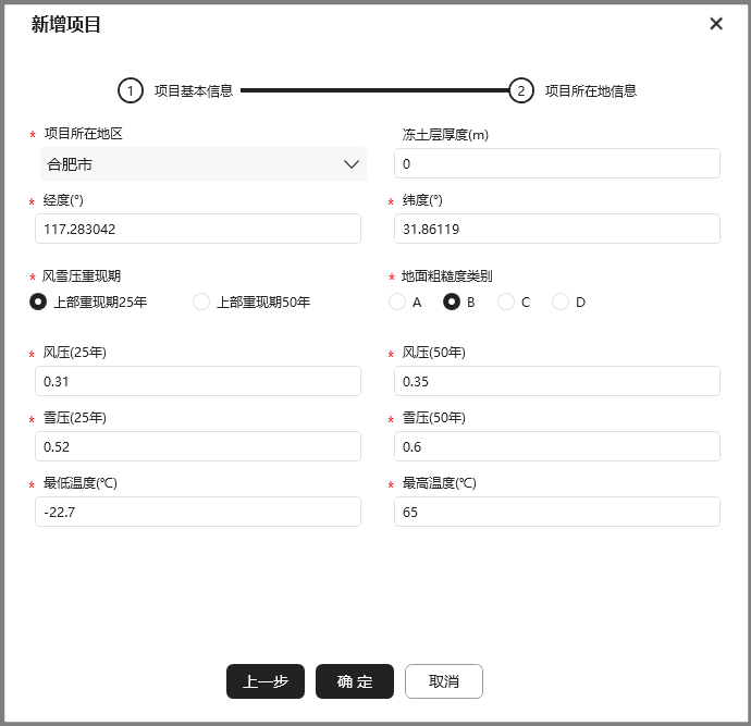 - 点击“下一步”,弹出“项目所在地信息”,选择“项目所在地区”即可自动带出项目经纬度、风雪压等参数,可根据设计要求修改风雪压重现期、地面粗糙度类别等参数,并且支持修改风雪压数值,软件根据输入进行设计